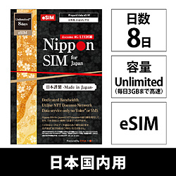 Nippon SIM for Japan eSIM無制限版 8日 毎日3GB 日本国内用ドコモ回線 プリペイドデータ eSIM DHA-SIM-419 [SMS非対応]