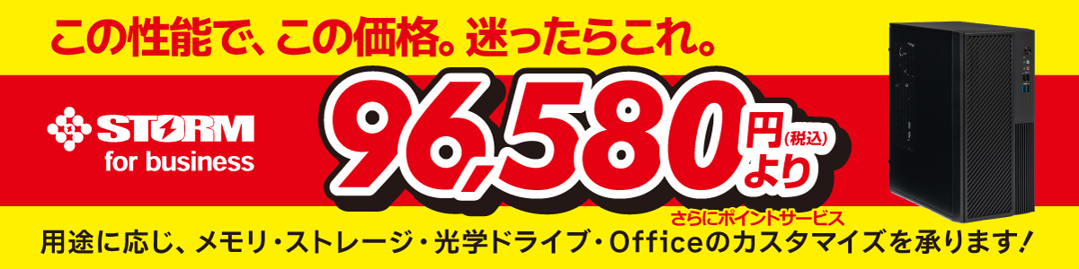 無駄を省いた低価格に、必要十分な処理能力と安定性を両立したラインナップをご紹介。 STORM for businessは、コストパフォーマンスに優れたAMD Ryzen 5プロセッサーを採用。OSの仕様からメモリ容量・Officeの有無まで、使用環境に合わせて最適な一台をお選びいただけます。通常の業務からクリエイティブなマルチタスクまで、快適な動作環境をご提供いたします。