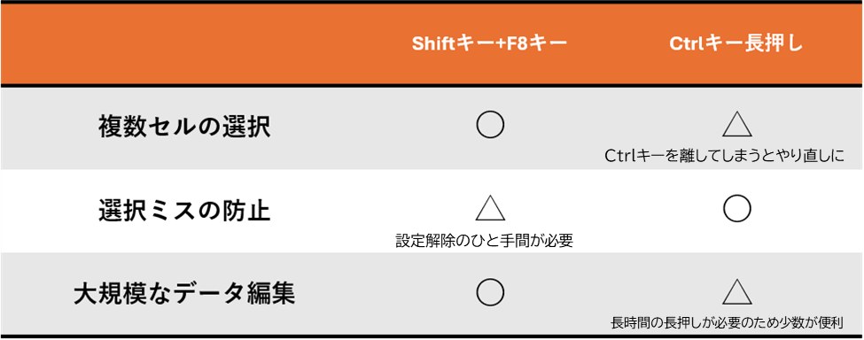 Shiftキー+F8キーとCtrlキー長押しの操作の比較をするとメリットやデメリットが存在します。用途や自分のやりやすさで選んでみることをオススメします。