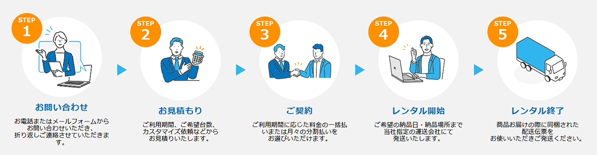 レンタルの開始日はお客様先到着日、レンタル終了日は契約書記載の期日になります。