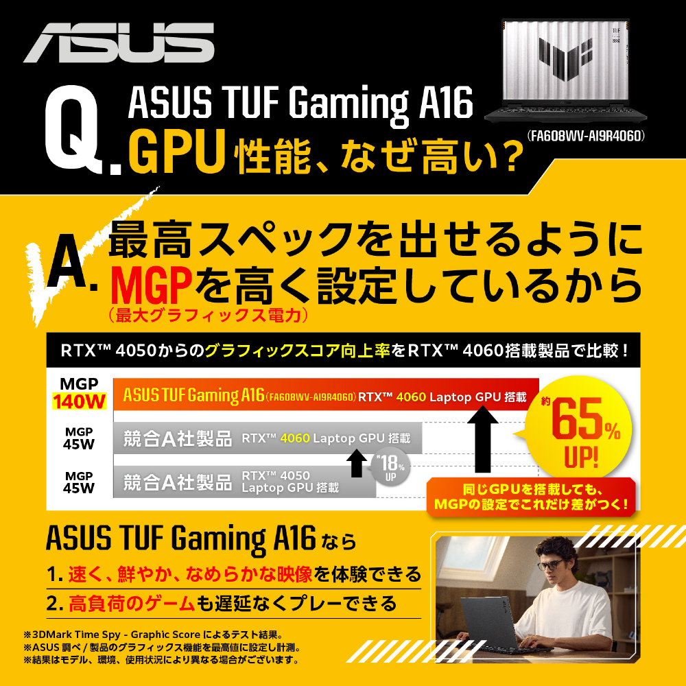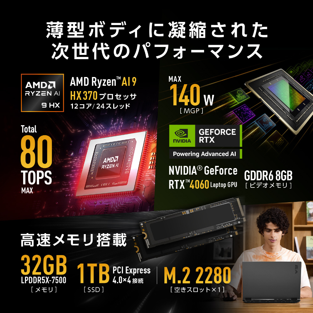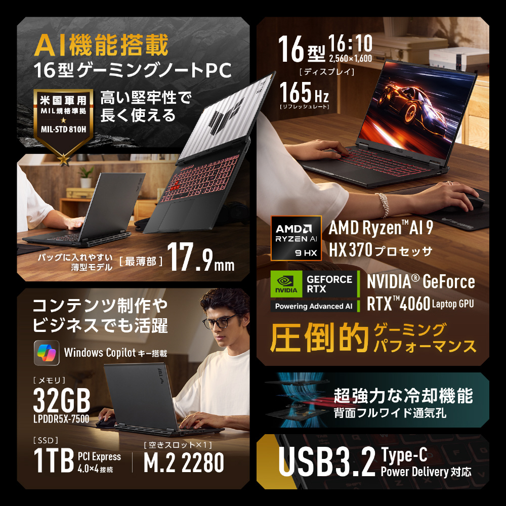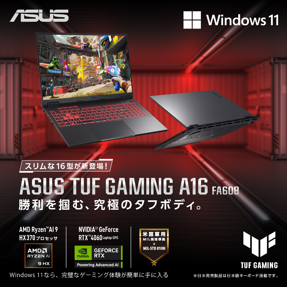 FA608WV-AI9R4060 ゲーミングノートパソコン TUF Gaming A16(RTX 4060) イェーガーグレー [16.0型 /Windows11 Home /AMD Ryzen AI 9 /メモリ:32GB /SSD:1TB /無し /日本語版キーボード /2024年9月モデル]
