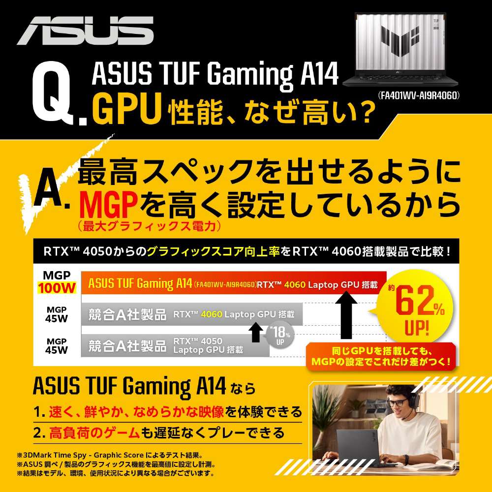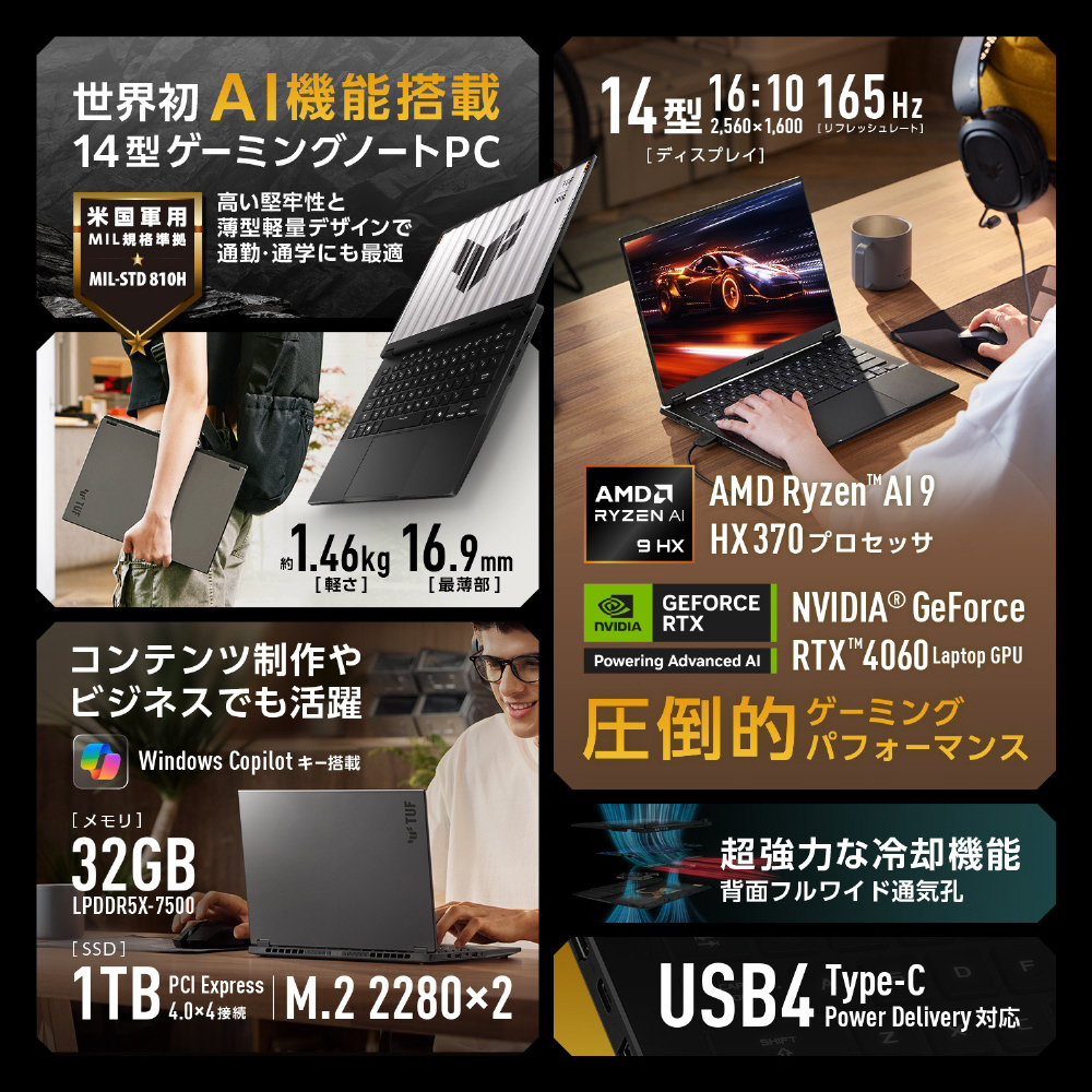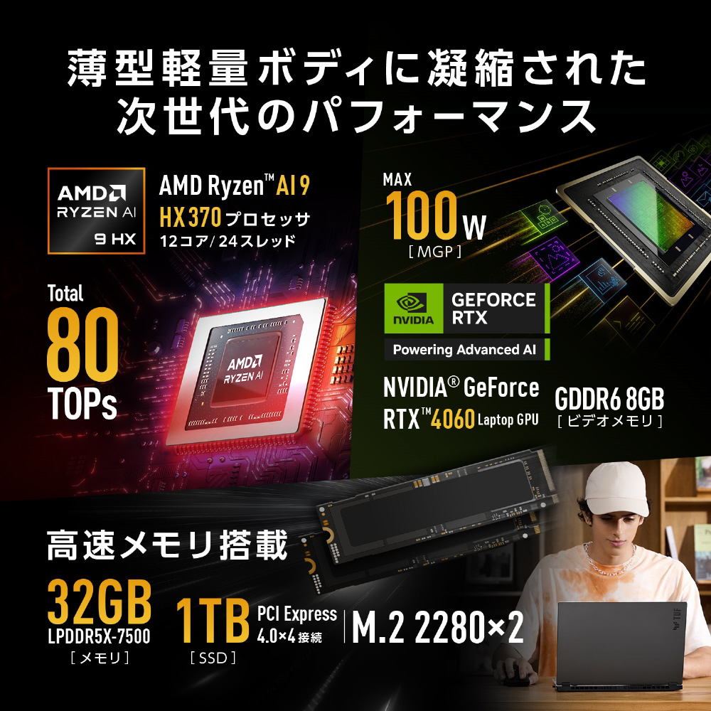 AMD Ryzen AI 9 HX 370 プロセッサを搭載。圧倒的な処理能力を持つRyzenプロセッサとAMD Ryzen AI XDNA 2 NPUで構成されており、ゲーム性能を大幅に向上させ、Windows CopilotツールなどのAI対応アプリも効率的に処理します。※AMD Performance LabsにてASUS Vivobook S16と比較した試験結果(2024年5月時点、ASUS調べ)※使用状況およびお使いの環境により結果は変動する可能性があります。