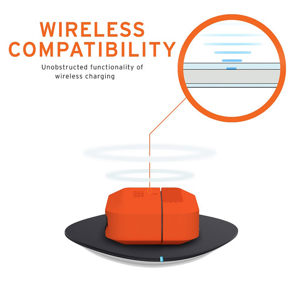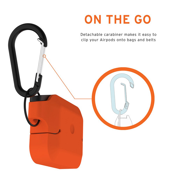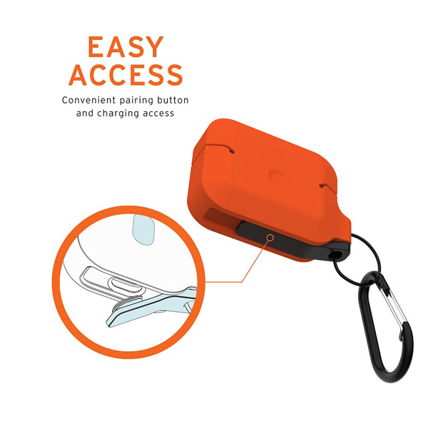 手触りの良いシリコーン製 AirPods Pro用ケース。オレンジのケースにグレーパーツのアクセントがあります。片手でオープンができLightningポートやペアリングボタンへのアクセスも可能です。