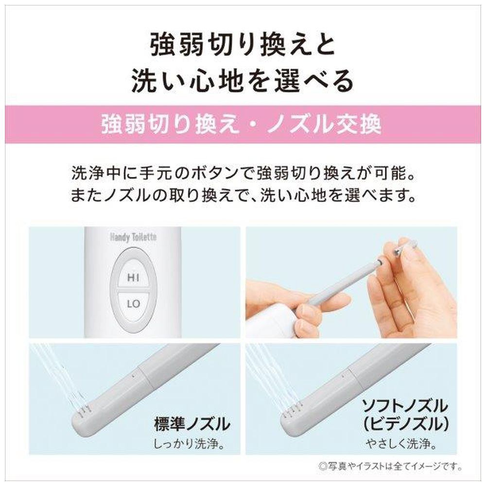 | 付属品 | ソフトノズル(ビデノズル)、ペットボトルアダプター(A/B)、単4形アルカリ乾電池×2本、ストラップ |