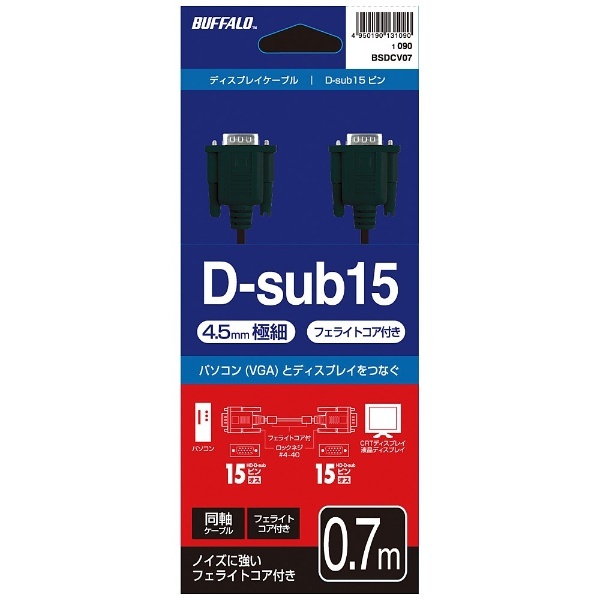 0.7m[HD-D-sub15pin ⇔ HD-D-sub15pin] ディスプレイケーブル 極細タイプ/フェライトコア付き ブラック BSDCV07BK [EU RoHS指令準拠]