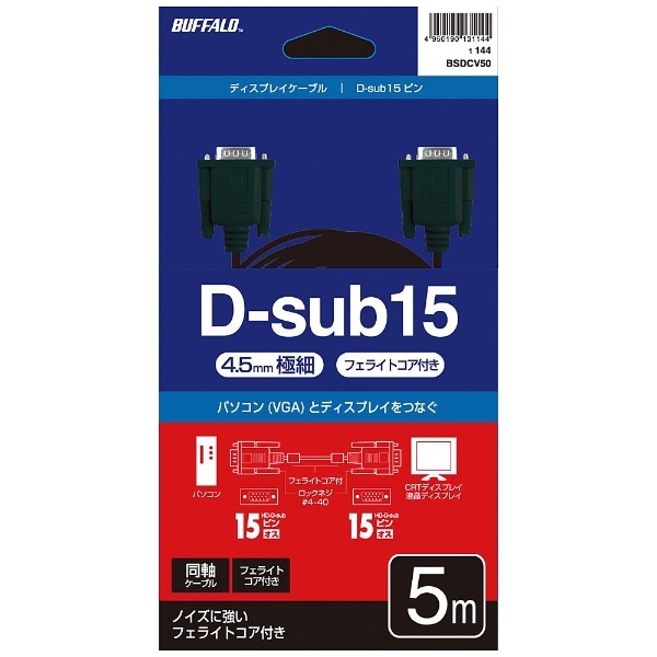 5m[HD-D-sub15pin ⇔ HD-D-sub15pin] ディスプレイケーブル 極細タイプ/フェライトコア付き ブラック BSDCV50BK