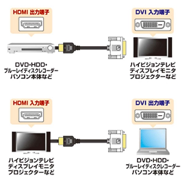 HDMI端子を持つ機器とDVI端子を持つ機器を接続するケーブル。2m。