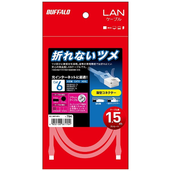 ツメの折れないLANケーブル。カテゴリー6対応。カーペットの下でも目立たないフラットタイプ。