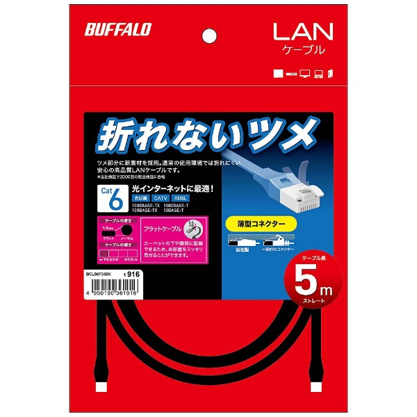 ツメの折れないLANケーブル。カテゴリー6対応。カーペットの下でも目立たないフラットタイプ。
