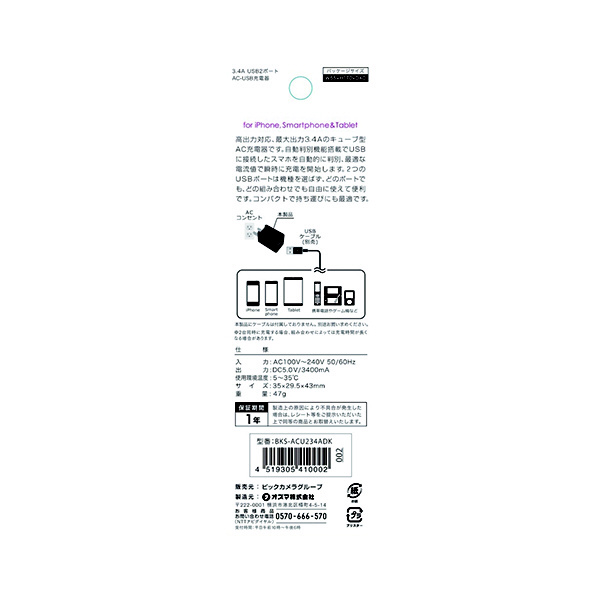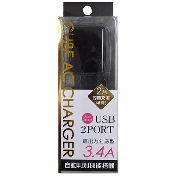 スマートフォン/タブレット対応 [USB給電] AC - USB充電器 3.4A 2ポート(USB-A×2) ブラック BKS-ACU234ADK 【ビックカメラグループオリジナル】 【864】