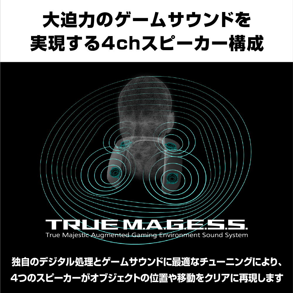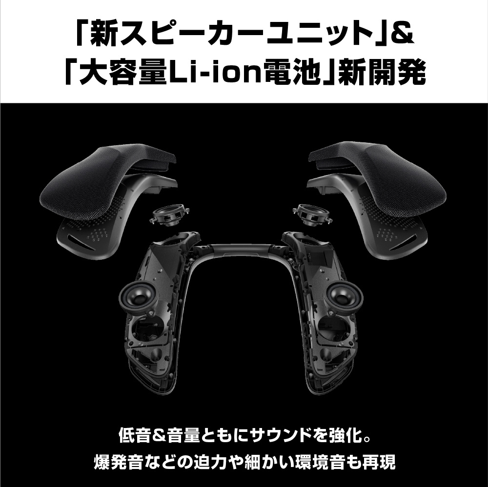4chスピーカー構成。従来品(SC-GN01)のスピーカー構造を一新し、口径を34mmから38mmへと大型化することで、中低域を中心に音圧をアップ。さらに、独自の音声信号処理によって定位感を向上させたことにより、リアリティのあるゲーム体験が楽しめます。