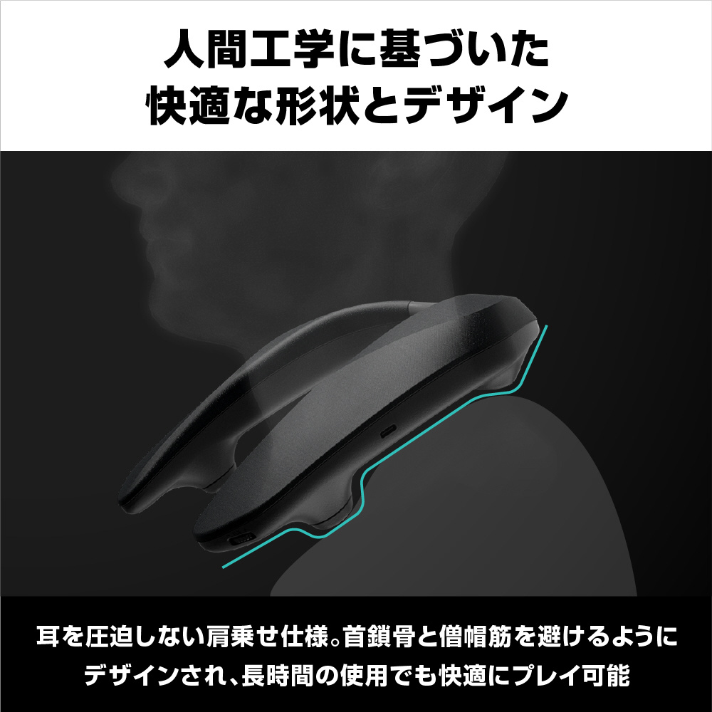 データ通信用低遅延専用無線モジュール採用により、パソコンやゲーム機に送信機※2を接続することでワイヤレス化を実現。ケーブルの制約から解放され、ゲームに没入※1できます。さらに、本体の左右4点で重さを分散する構造により、首回りのストレスを感じにくく、長時間プレイしても疲れず集中してゲームが楽しめます。