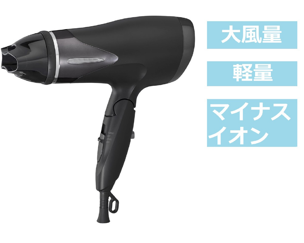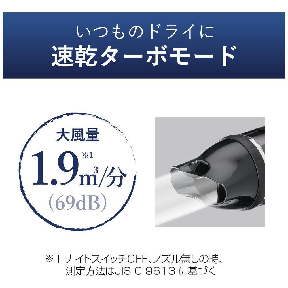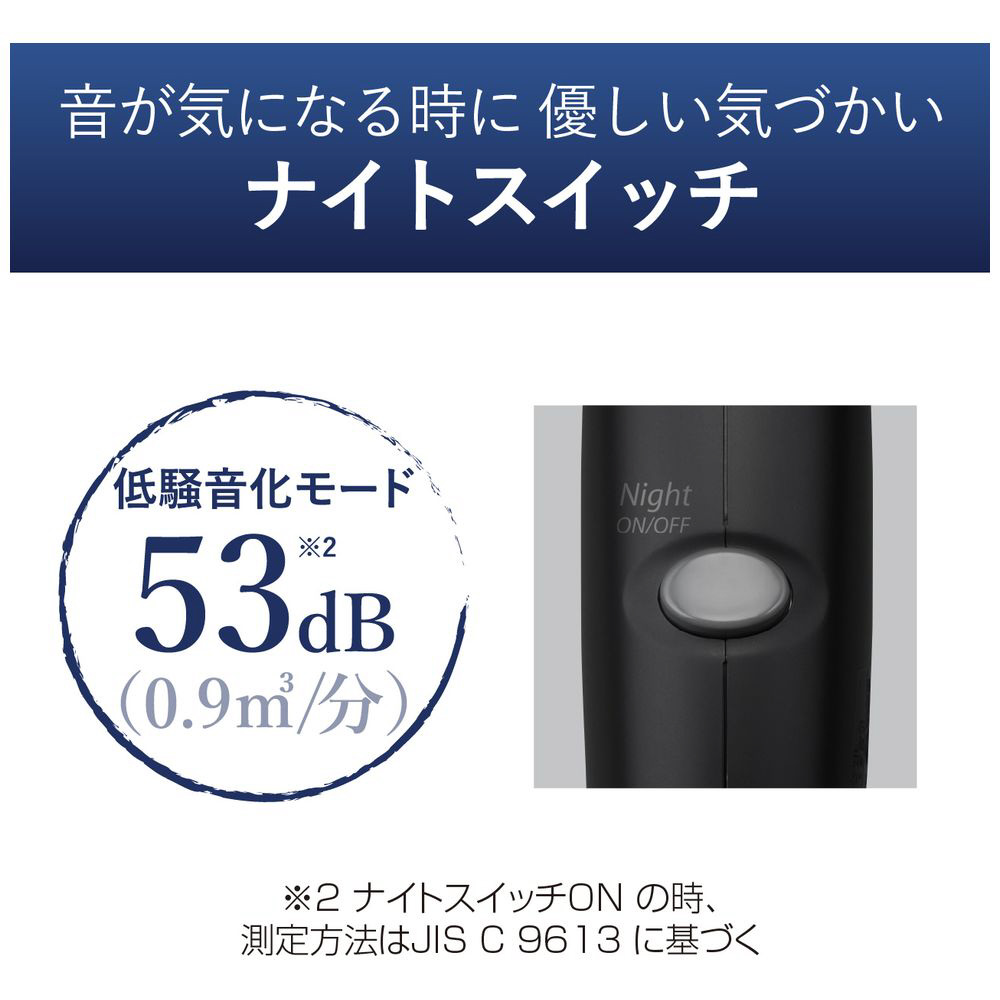 大風量1.9m3分のターボモードと低騒音53dBのナイトスイッチを使い分け。2箇所からマイナスイオンを発生するツインマイナスイオン発生機構搭載。