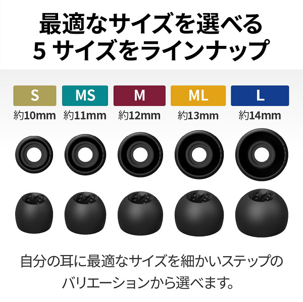 選べる5サイズ(S/MS/M/ML/L)をラインアップ。また、各サイズが区別しやすいよう、サイズごとに異なる凸点をイヤーピースの底面にレイアウトしています。