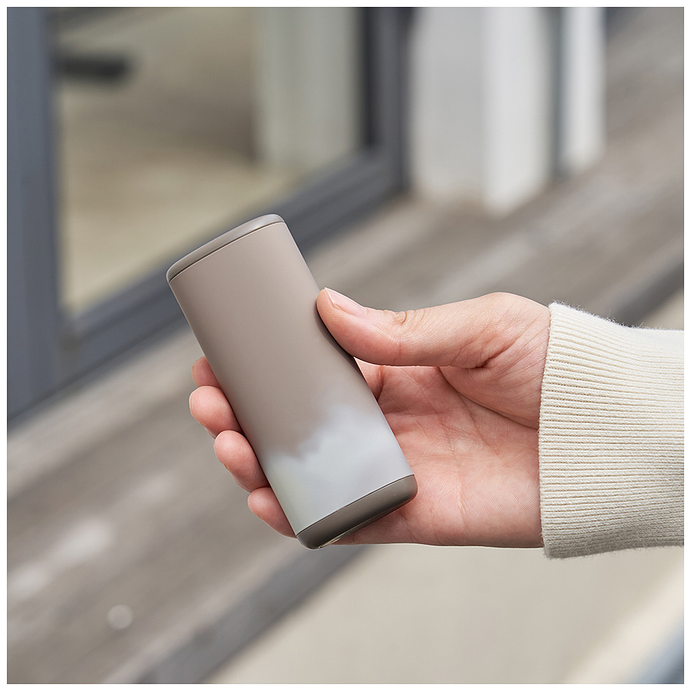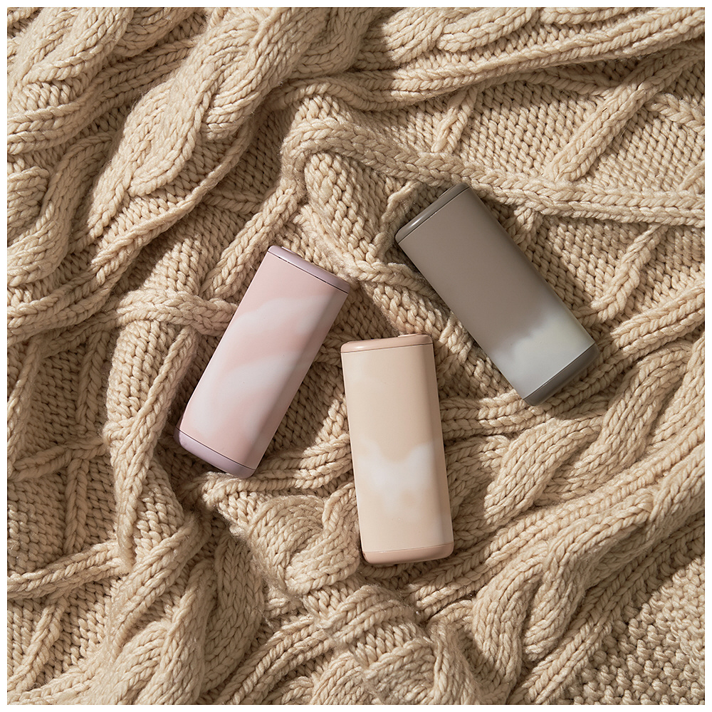 ペットボトルや缶などの丸みのあるあたたかい飲み物のようなフォルムで、握ったときに指先から手のひらまでフィットし、じんわりあたためます。