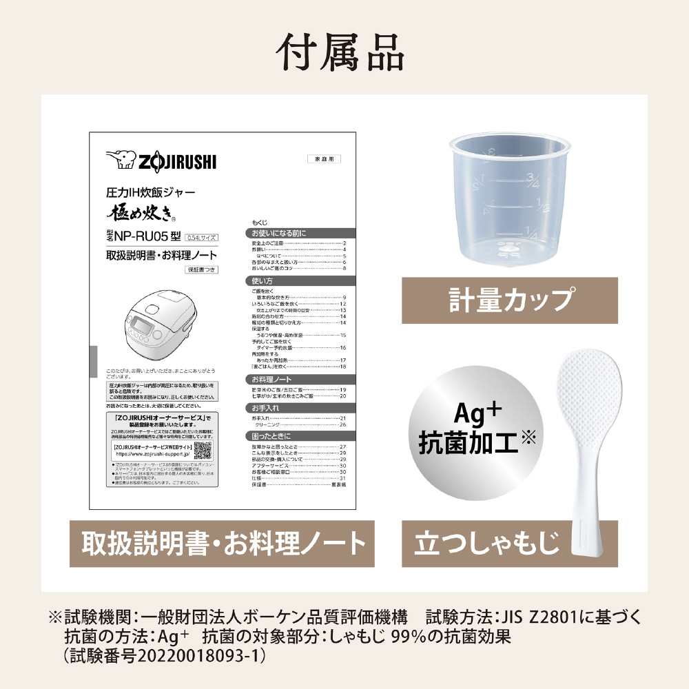 | 付属品 | 立つしゃもじ(Ag+抗菌加工)・白米用計量カップ(約180mL = 約1合)・取扱説明書(お料理ノート・保証書) |