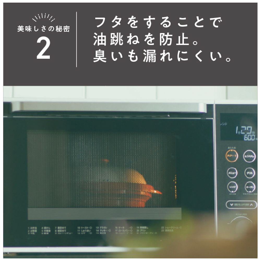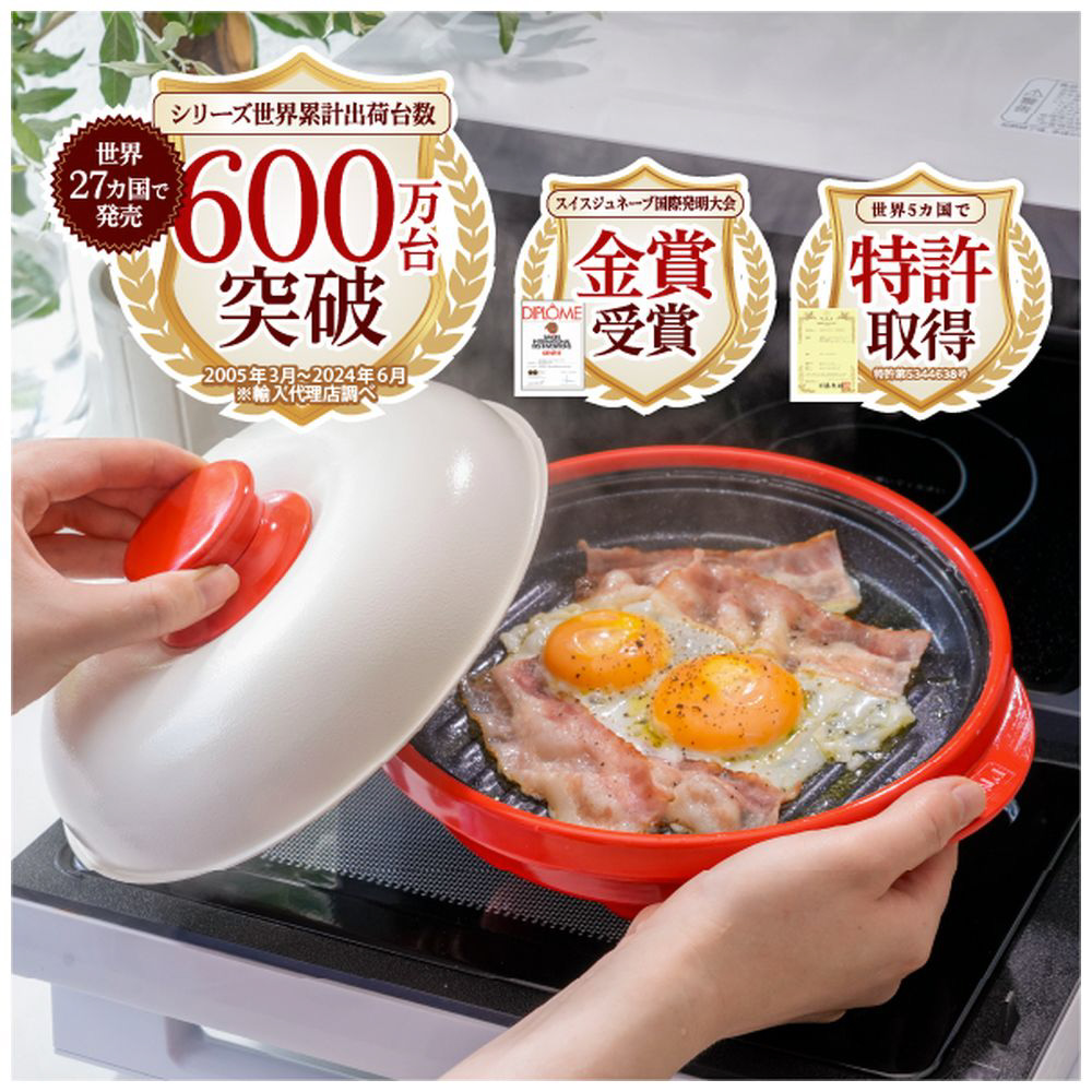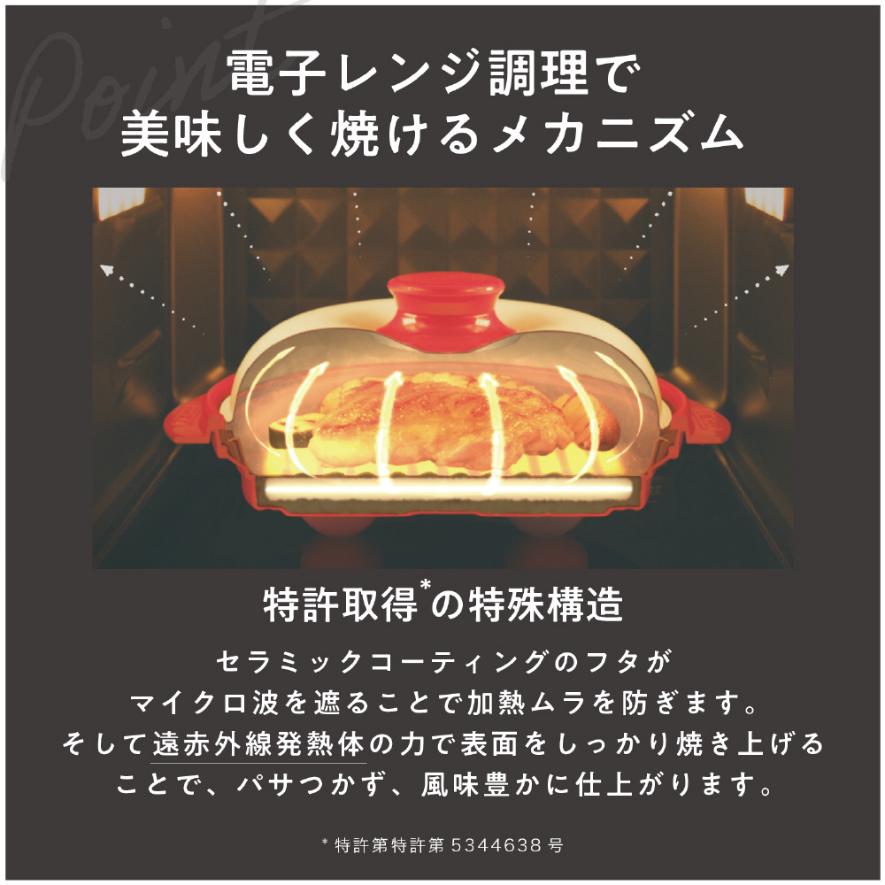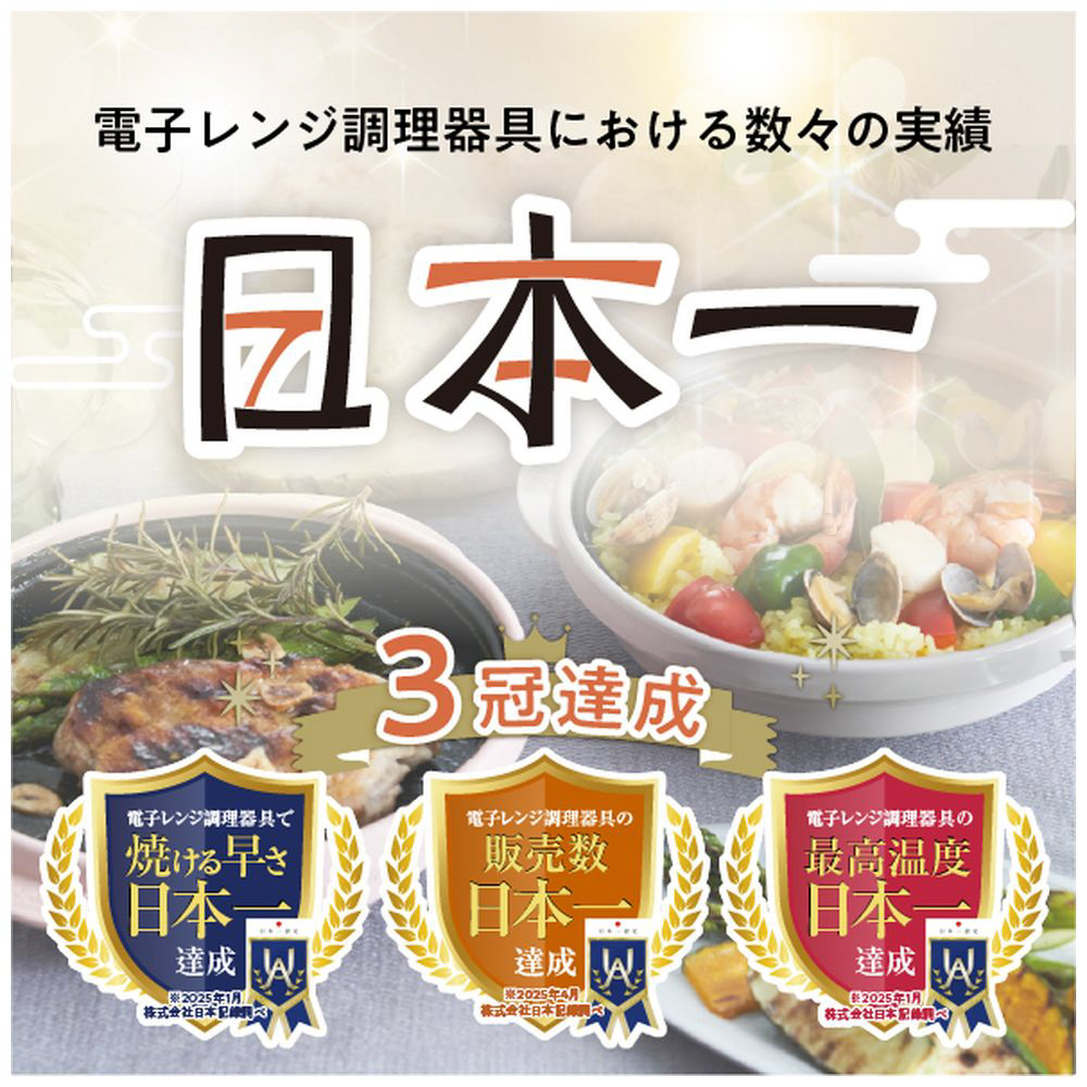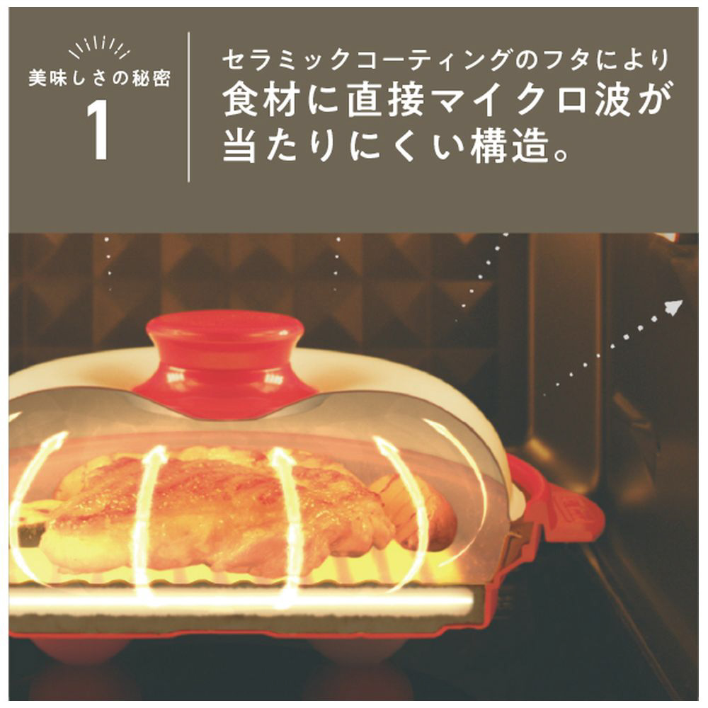 【電子レンジ専用調理器具】【シリーズ累計世界出荷台数600万台突破】電子レンジでまるで直火のような焼き目がつく!メーカー独自開発の遠赤外線発熱体により、外はパリッと、中はジューシーに仕上がります。炒める・焼く・煮る・蒸す・炊く・茹でる・再加熱・アレンジと、これ1台で本格的な8役の調理が可能。専用レシピブック(44品付き)で、毎日の献立も簡単・手軽に。