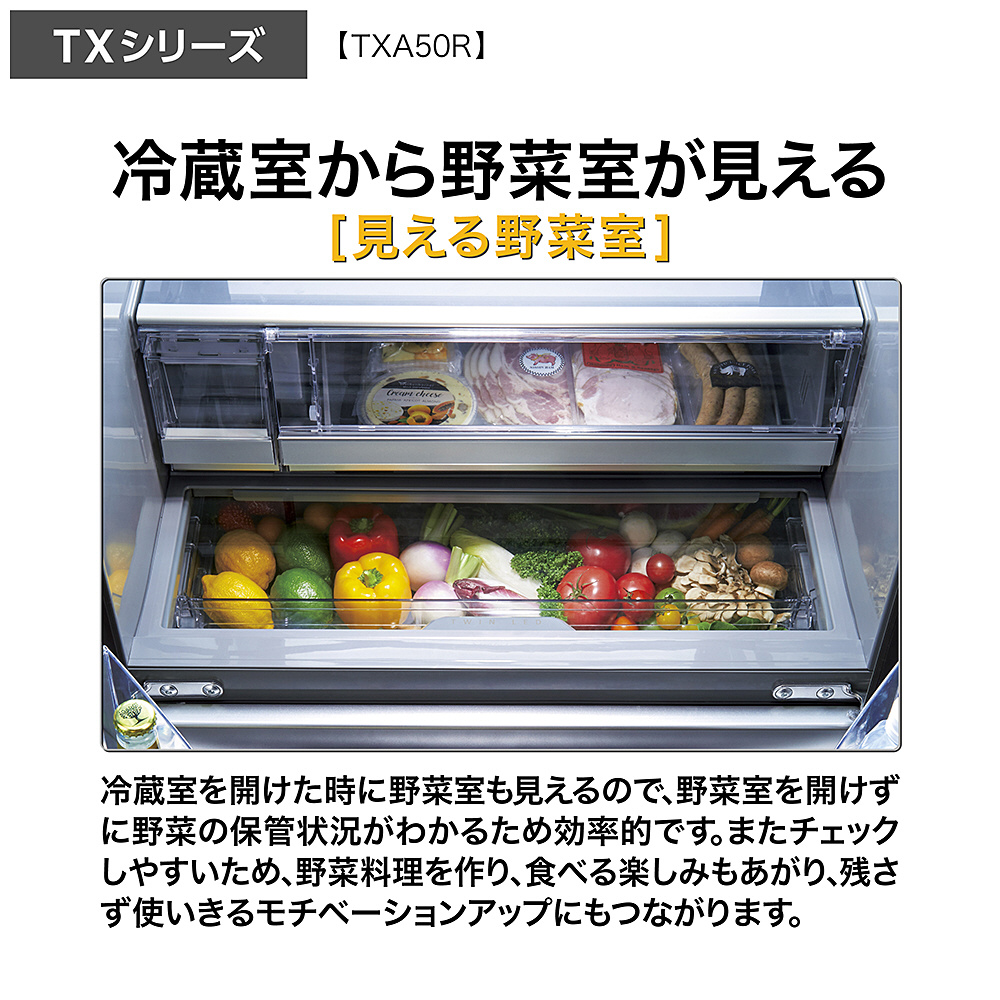 冷蔵室を開けた時に野菜室も見えるので、野菜室を開けずに野菜の保管状況がわかるため効率的です。またチェックしやすいため、野菜料理を作り、食べる楽しみもあがり、残さず使いきるモチベーションアップにもつながります。