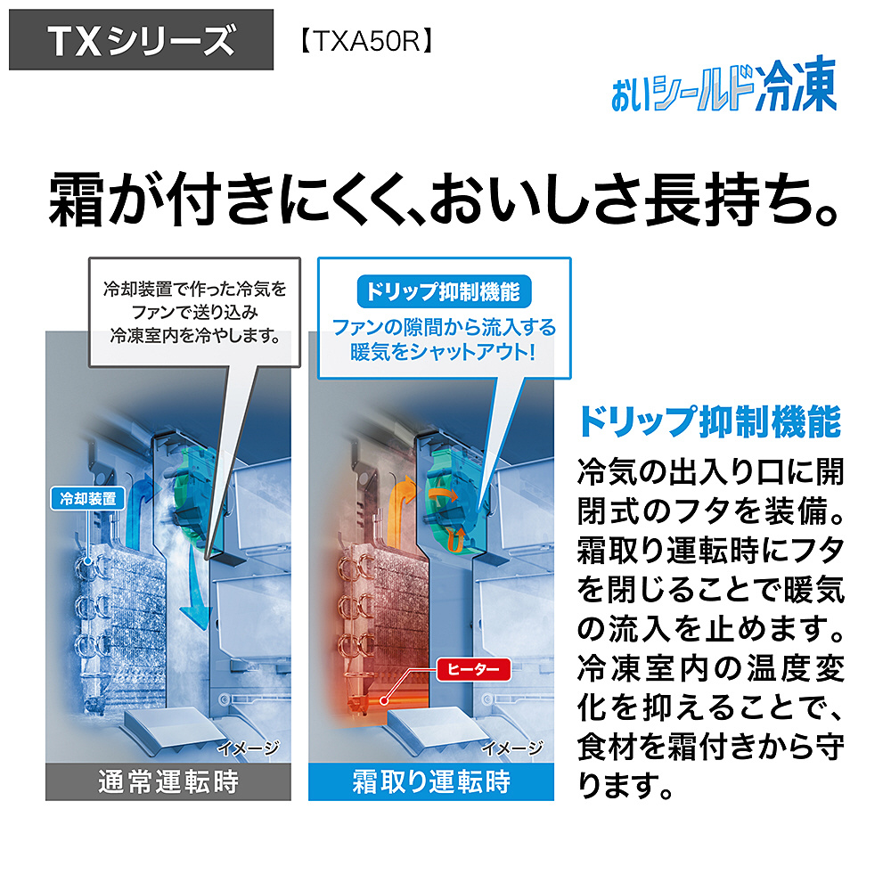 ドリップ抑制機能を搭載した「おいシールド冷凍」は、冷気の出入り口に開閉式のフタを装備。霜取り運転時にフタを閉じることで暖気の流入を止めます。冷凍室内の温度変化を抑えることで、食材を霜つきから守ります。