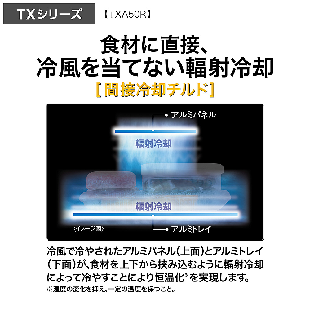冷風で冷やされたアルミパネル(上面)とアルミトレイ(下面)が、食材を上下から挟み込むように輻射冷却によって冷やすことにより恒温化※を実現します。