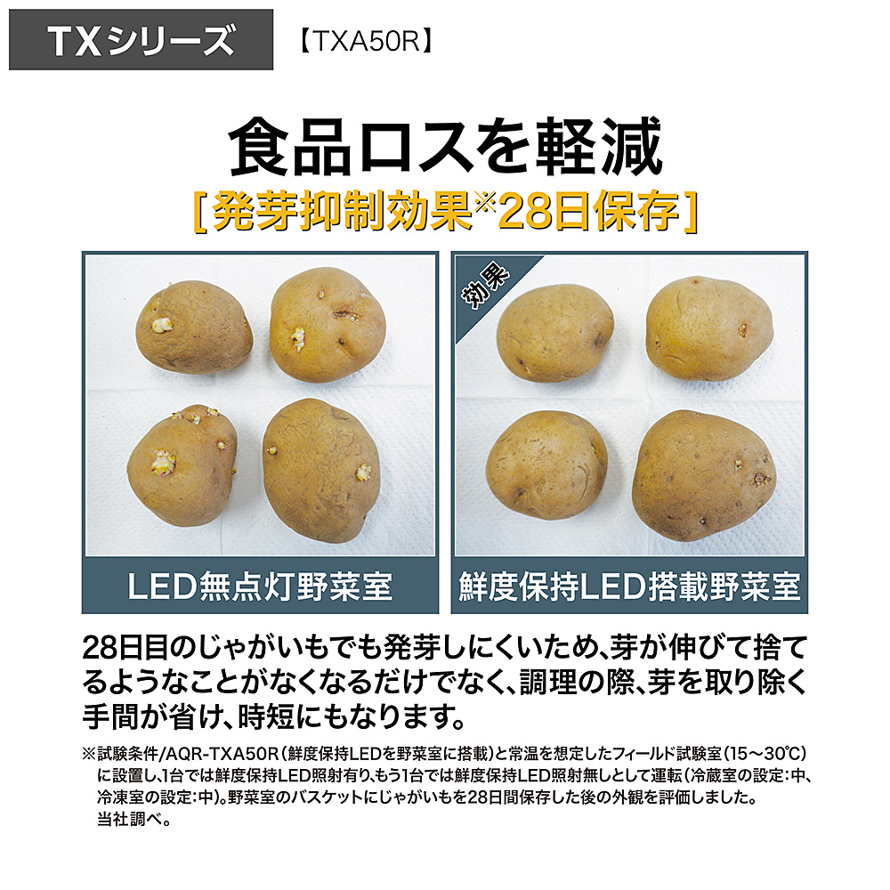 ※試験条件/AQR-TXA50R(鮮度保持LEDを野菜室に搭載)と常温を想定したフィールド試験室(15〜30℃)に設置し、1台では鮮度保持LED照射有り、もう1台では鮮度保持LED照射無しとして運転(冷蔵室の設定:中、冷凍室の設定:中)、野菜室のバスケットにじゃがいもを28日間保存した後の外観を評価しました。