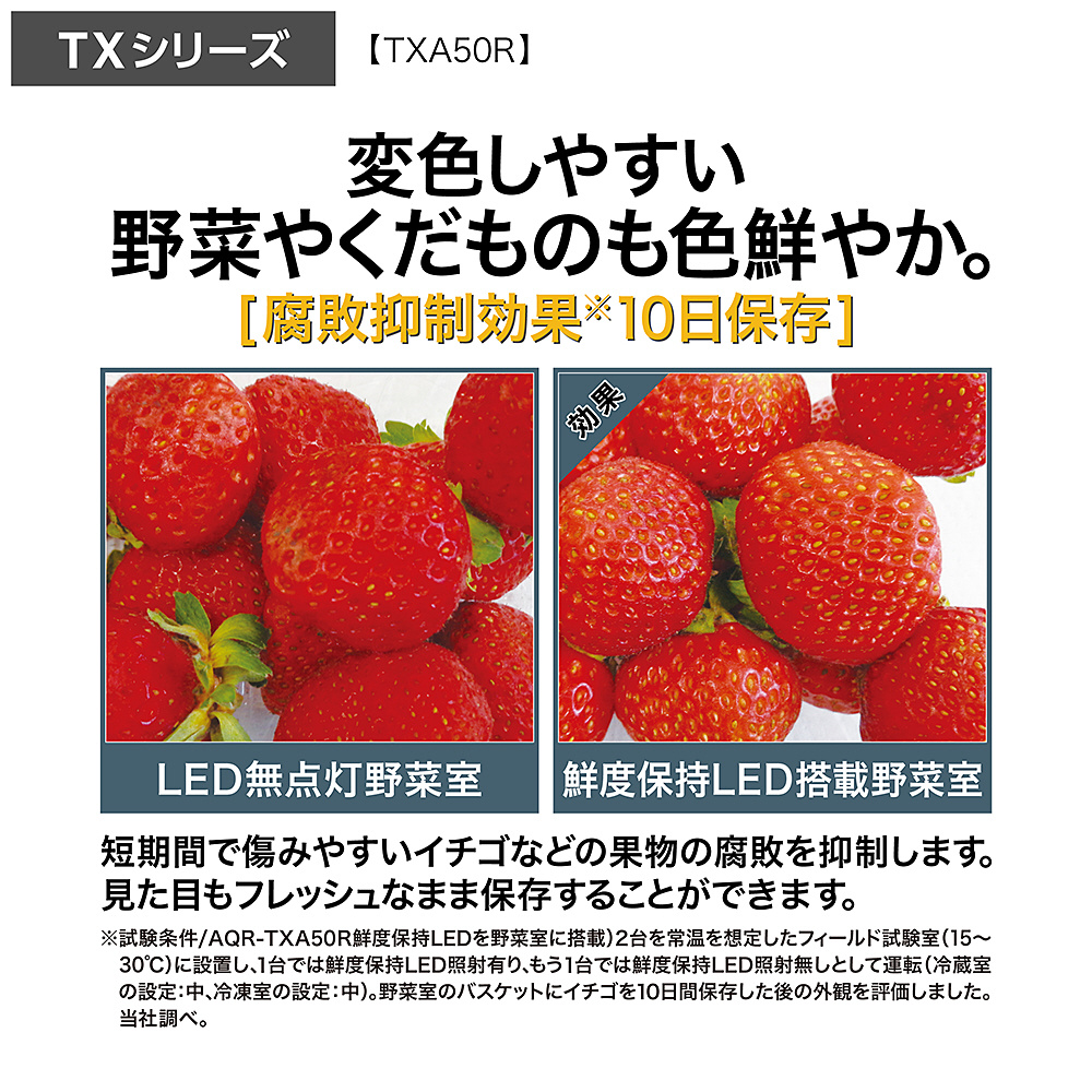 短期間で傷みやすいイチゴなどの果物の腐敗を抑制します。見た目もフレッシュなまま保存することができます。 ※試験条件/AQR-TXA50R(鮮度保持LEDを野菜室に搭載)2台を常温を想定したフィールド試験室(15〜30℃)に設置し、1台では鮮度保持LED照射有り、もう1台では鮮度保持LED照射無しとして運転(冷蔵室の設定:中、冷凍室の設定:中)、野菜室のバスケットにイチゴを10日間保存した後の外観を評価しました。