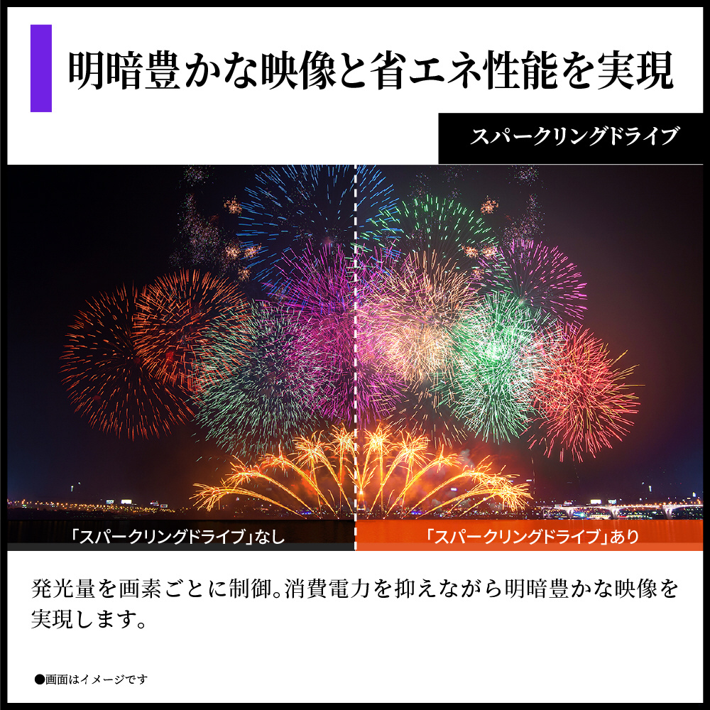 ・発光量を緻密に制御する「スパークリングドライブ」回路により、漆黒からきらめきまで明暗を豊かに表現し、ダイナミックな映像を表示します。
