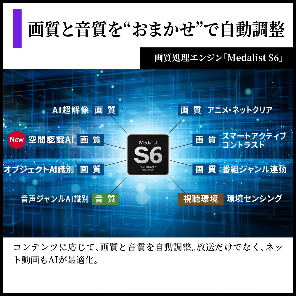 ・次世代AIプロセッサーを採用した画像処理エンジン「Medalist S6X」が実現する画質/音質モード「AIオート」は、コンテンツに応じて画質と音質をおまかせで自動調整します。