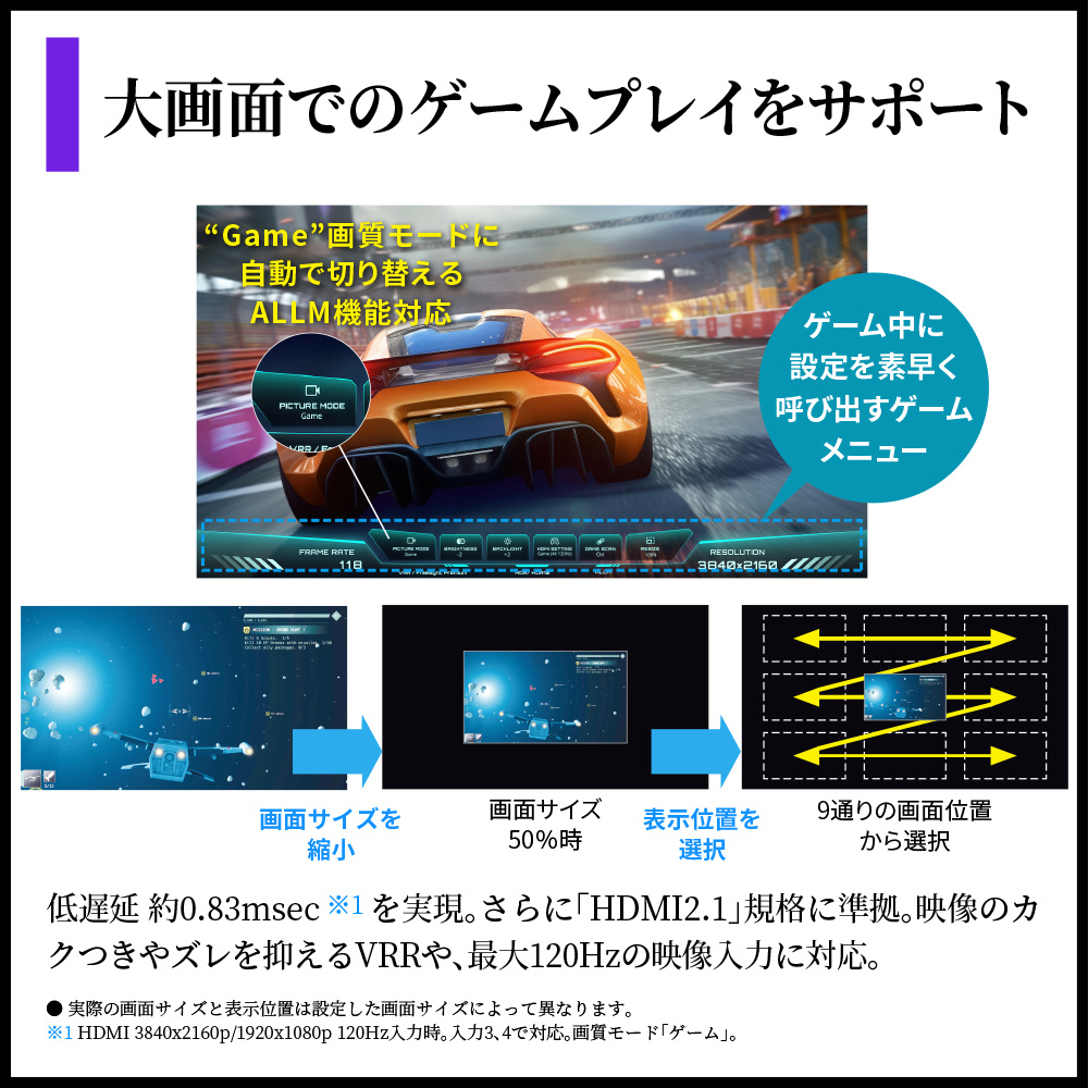 ・4K/144Hz VRR入力対応のHDMIを2系統搭載。動きの速いゲーム映像を滑らかに表示。低遅延 約0.83msecで大画面テレビでのゲームプレイをサポート。