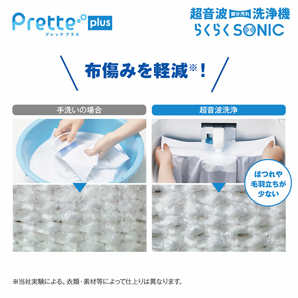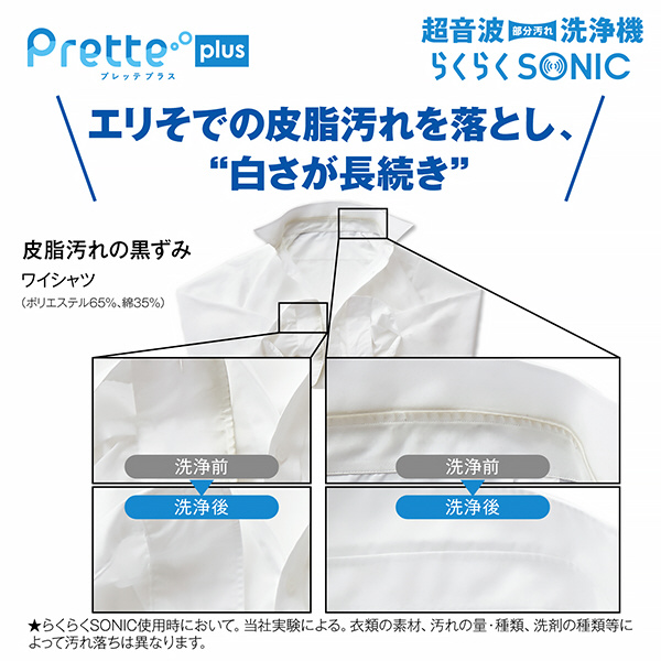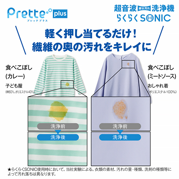 お洗濯前に気になる部分汚れ(食べこぼしや皮脂汚れ)をかんたんキレイに!超音波洗浄機らくらくSONIC搭載。超音波ホーンに約30秒軽く当てるだけで繊維の奥の汚れをキレイに!手洗いのようにこすらないので、大切な衣類を長く着続けることが出来ます。