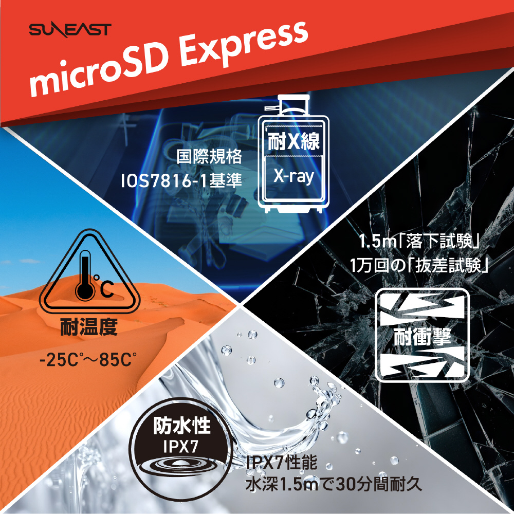 SUNEAST microSD Expressカードは耐温度性能:-25〜85℃、耐衝撃:1.5m落下・1万回の抜き差し試験クリア、防水性能:IPX7(水深1.5mで30分耐久)、耐X線:ISO7816-2準拠の性能を備えています。