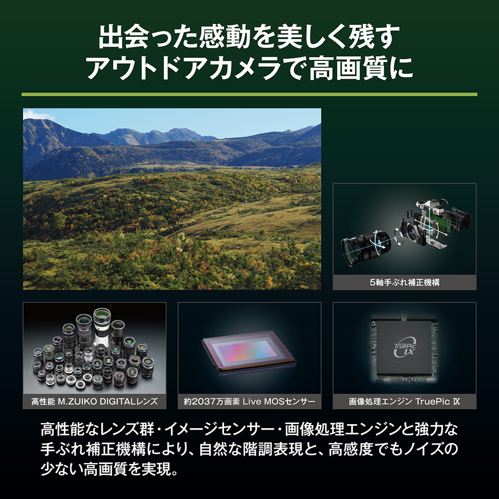 ボディー内5軸手ぶれ補正機構を搭載し、中央最大6.5段、周辺最大5.5段、さらに対応レンズとの組み合わせによる「5軸シンクロ手ぶれ補正」では、中央最大7.5段、周辺最大6.5段の補正効果が得られます。強力な手ぶれ補正により、幅広い条件での手持ち撮影を可能にし、アウトドアで出会うさまざまなシャッターチャンスに瞬時に対応する小型軽量システムといえます。