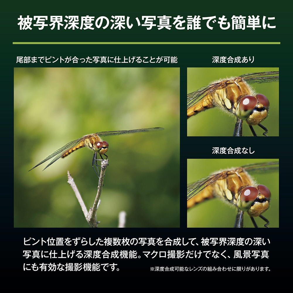 また、世界中のプロ写真家から定評のあるスーパーソニックウェーブフィルター(SSWF)によるダストリダクションシステムを搭載しており、カメラの電源を入れる度に30000回/秒以上の超高速振動でイメージセンサー部のゴミ・ホコリを瞬時に除去します。イメージセンサーに付着したゴミ・ホコリの写り込みを気にすることなく、アウトドアでも安心してレンズ交換を行うことができ撮影を楽しめます。