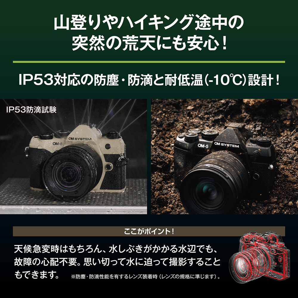 各部にシーリングを施し、防塵・防滴保護等級 IP53、-10℃の耐低温という高い耐候性能を備えています。そのため、アウトドアでの突然の降雨、降雪や、滝などの水しぶきがかかる過酷な撮影条件下においても、機材の心配をすることなくシャッターチャンスに集中 できます。
