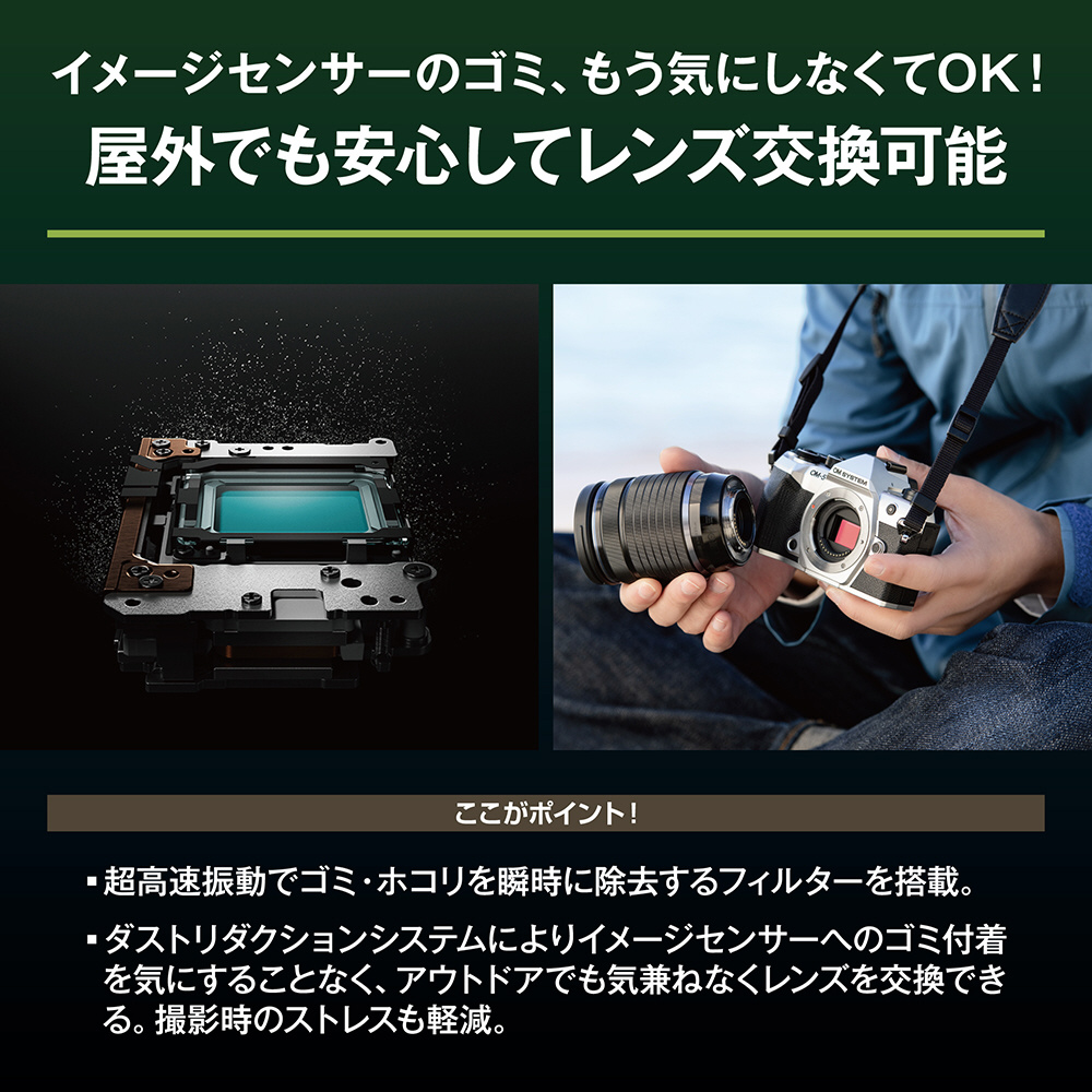 また、世界中のプロ写真家から定評のあるスーパーソニックウェーブフィルター(SSWF)によるダストリダクションシステムを搭載しており、カメラの電源を入れる度に30000回/秒以上の超高速振動でイメージセンサー部のゴミ・ホコリを瞬時に除去します。イメージセンサーに付着したゴミ・ホコリの写り込みを気にすることなく、アウトドアでも安心してレンズ交換を行うことができ撮影を楽しめます。