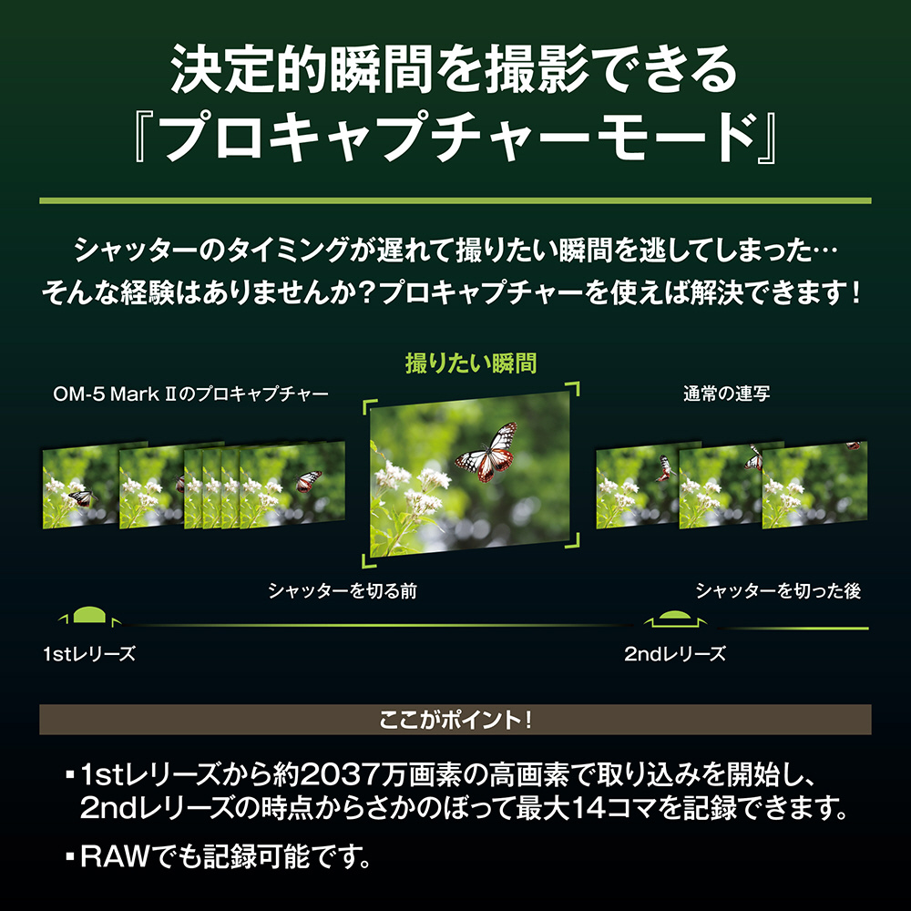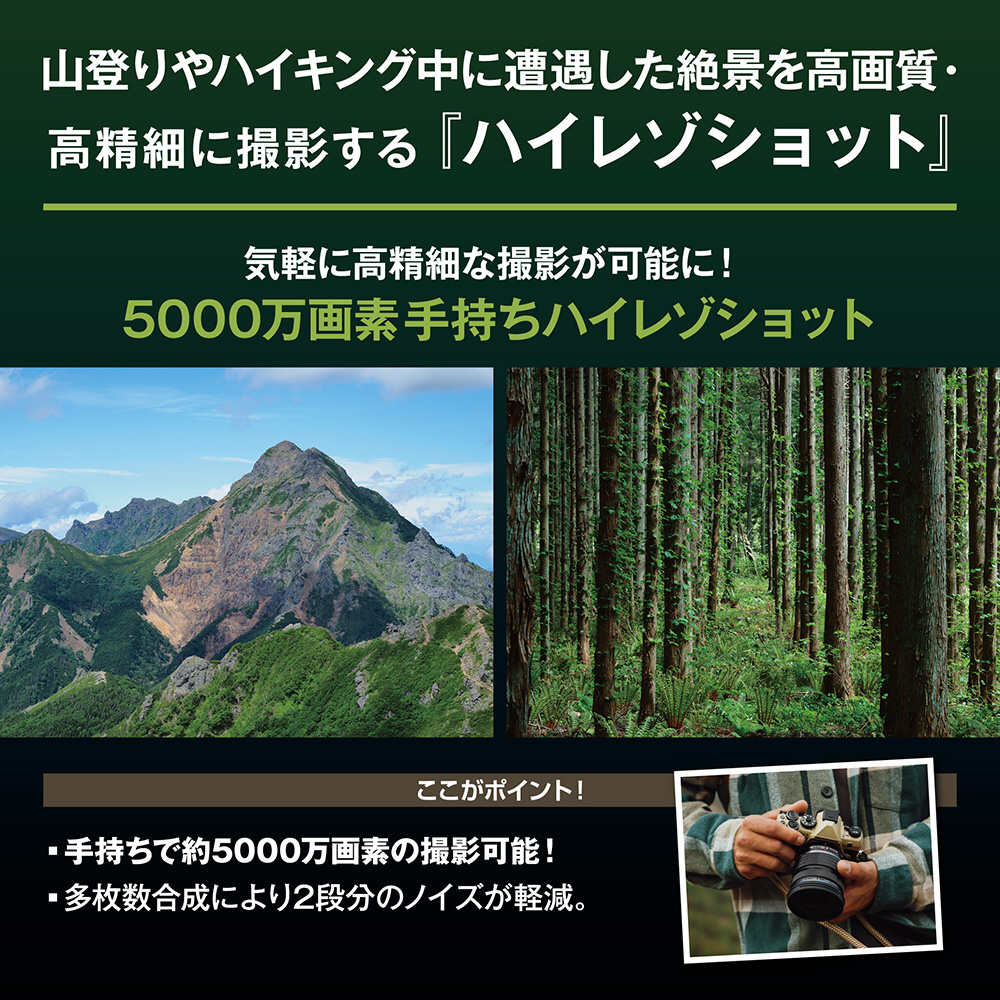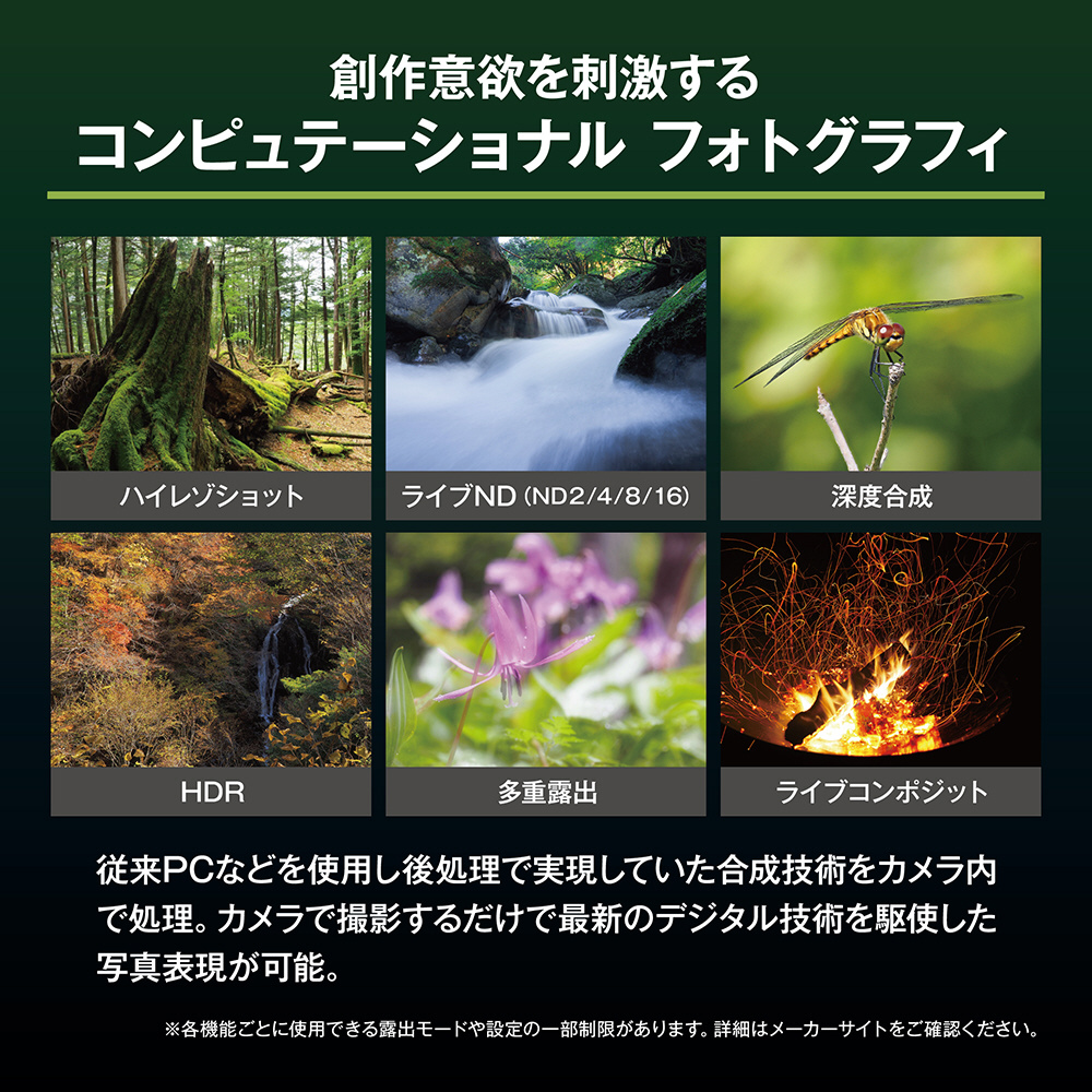 従来PCなどを使用して後処理で実現していた合成技術を、カメラ内で処理する「コンピュテーショナル フォトグラフィ」撮影機能を搭載しています。カメラで撮影するだけで、最新のデジタル技術を駆使した新しい写真表現を実現します。本機能を手軽に使って楽しんでいただくために、CP(コンピュテーショナル撮影) ボタンを新たに設けました。CPボタンを押しながらコントロールダイヤルを回すことで、以下の撮影機能に簡単に切り替えることができます。三脚ハイレゾショット、手持ちハイレゾショット、ライブ ND(ND2-16)、深度合成、HDR、多重露出。ほかにも、星などの光跡撮影等では、背面モニターで途中経過を確認しながら撮影できる「ライブコンポジット」 や、シャッターボタンを押した瞬間から遡って記録することで決定的瞬間を撮り逃さない「プロキャプチャー」など多彩な撮影機能を備えています。
