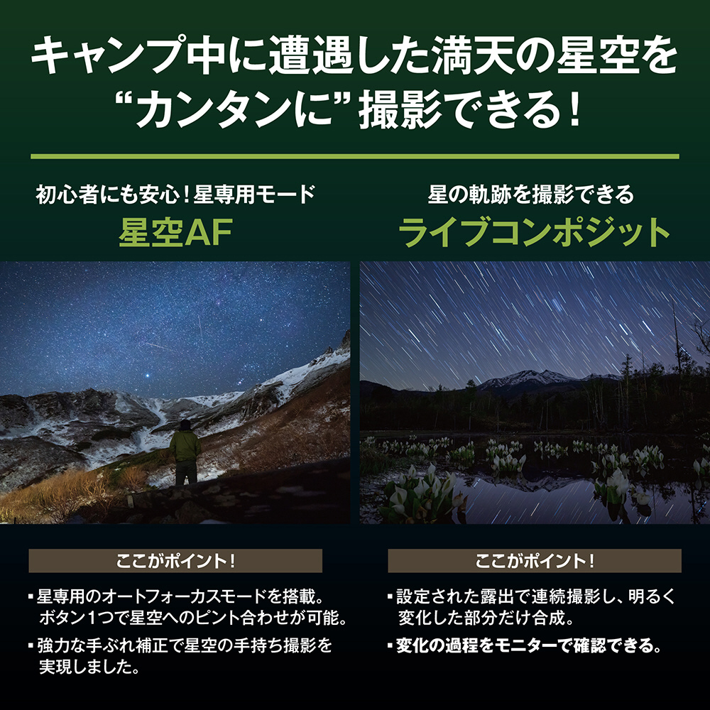 ■アウトドア体験を思いのままに写す「コンピュテーショナル フォトグラフィ」ほか多彩な撮影機能