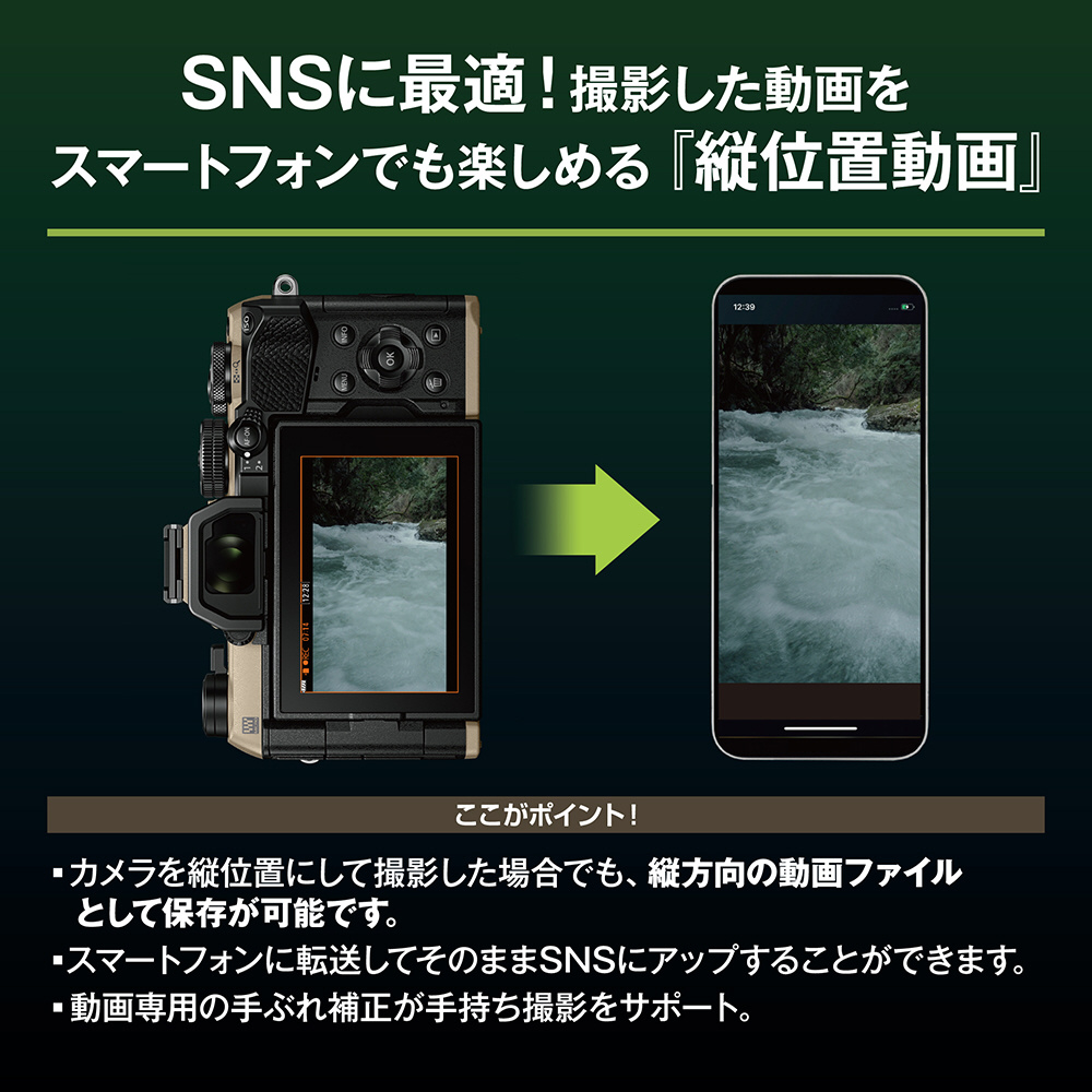 ボディー内5軸手ぶれ補正機構を搭載し、中央最大6.5段、周辺最大5.5段、さらに対応レンズとの組み合わせによる「5軸シンクロ手ぶれ補正」では、中央最大7.5段、周辺最大6.5段の補正効果が得られます。強力な手ぶれ補正により、幅広い条件での手持ち撮影を可能にし、アウトドアで出会うさまざまなシャッターチャンスに瞬時に対応する小型軽量システムといえます。