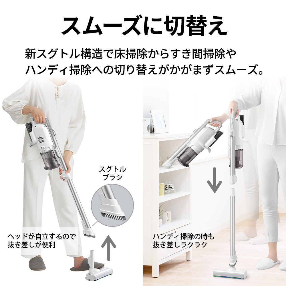 今回新たに吸込口にパイプを装着した状態でも自立する「新スグトル構造」により、棚や階段などの掃除に便利なハンディ掃除のスタイルへの切り替えをかがまずスムーズにできるようになりました。すき間掃除のスタイルに切り替える時もパイプ上のレバーを引くだけで、ワンタッチで吸込口を外せ、また吸込口のパイプ部が自立するため、床掃除を再開する際にもかがまずに切り替えできます。