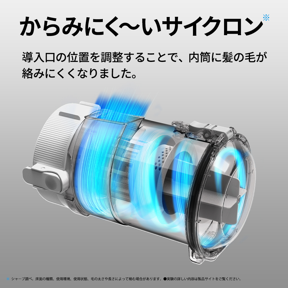 ※シャープ調べ。床面の種類、使用環境、使用状態、毛の太さや長さによって絡む場合があります。●実験の詳しい内容は製品サイトをご覧ください。