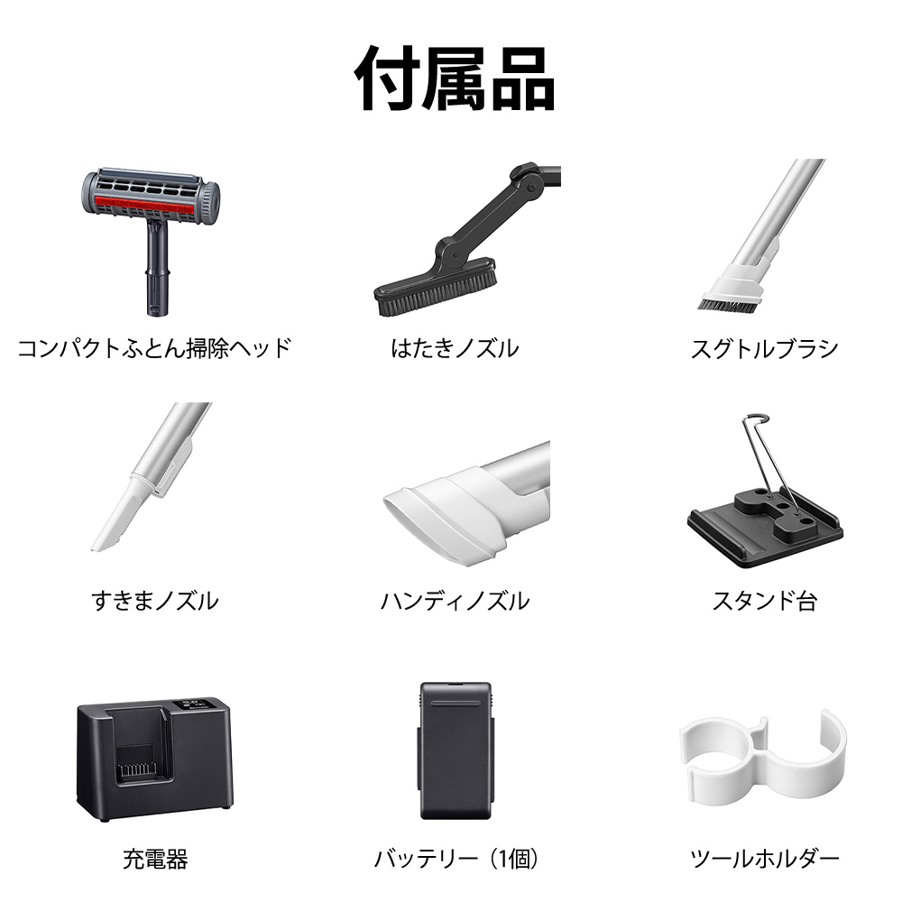 付属品 スグトルブラシ、バッテリー、すき間ノズル、ツールホルダー、 ハンディノズル、充電器、はたきノズル、スタンド台、コンパクトふとん掃除ヘッド