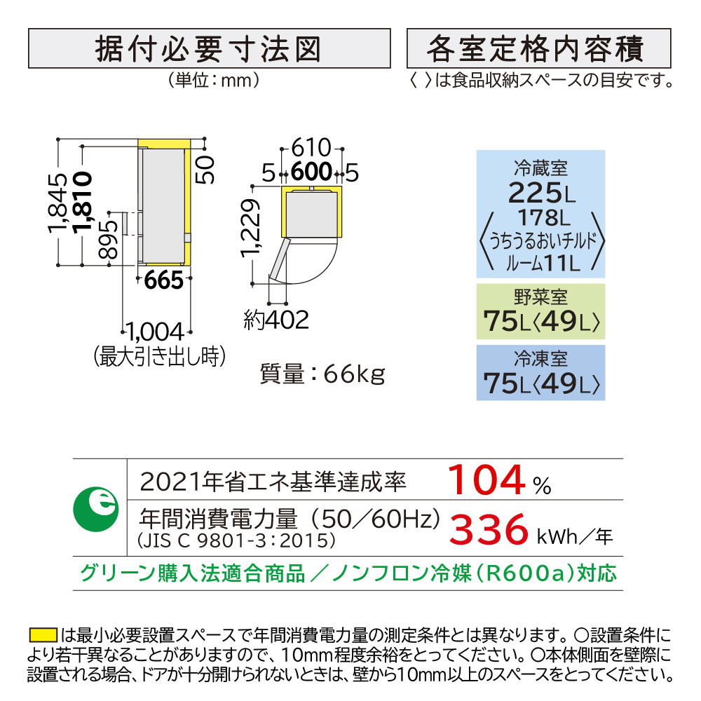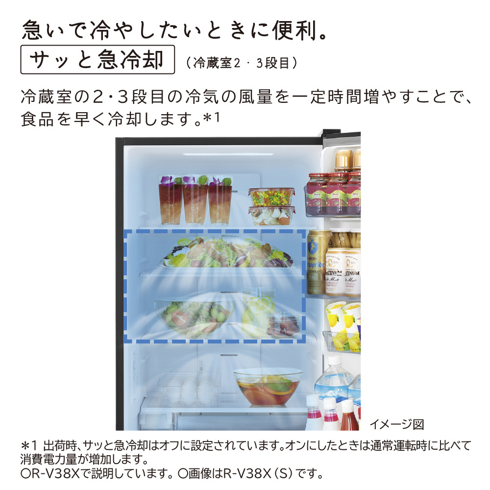 シンプルデザインのスリム幅60cm「まんなか野菜」。食品を急いで冷やしたいときに便利「サッと急冷却」。乾燥を抑える「うるおいチルド」「うるおい野菜室」。