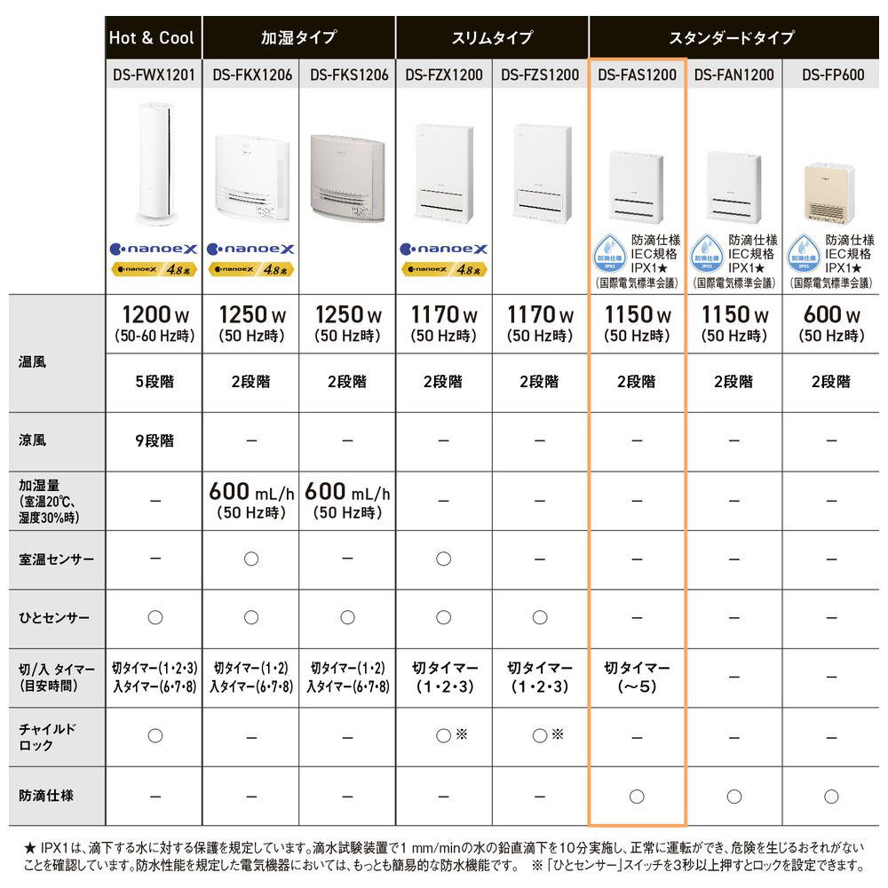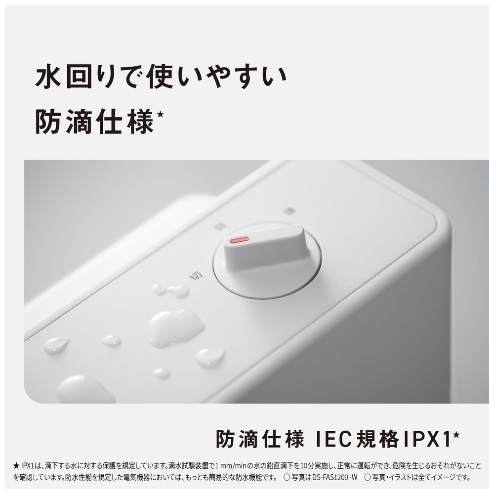 水回りにも使いやすい防滴仕様IPX1(※IPX1 は、滴下する水に対する保護を規定しています。滴下試験装置で1[mm/min]の水の鉛直滴下を10 分間実施し、正常に運転ができ、危険を生じるおそれがないことを確認しています。防水性能を規定した電気機器においては、もっとも簡易な防水性能です。※)