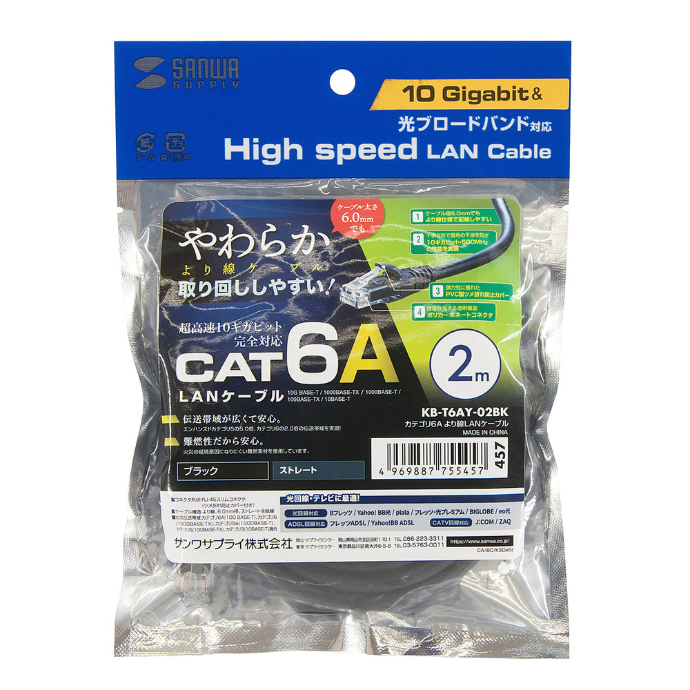 | 商品名 | KB-T6AY-02BK LANケーブル PoE対応 ブラック [2m /カテゴリー6A /スタンダード] |