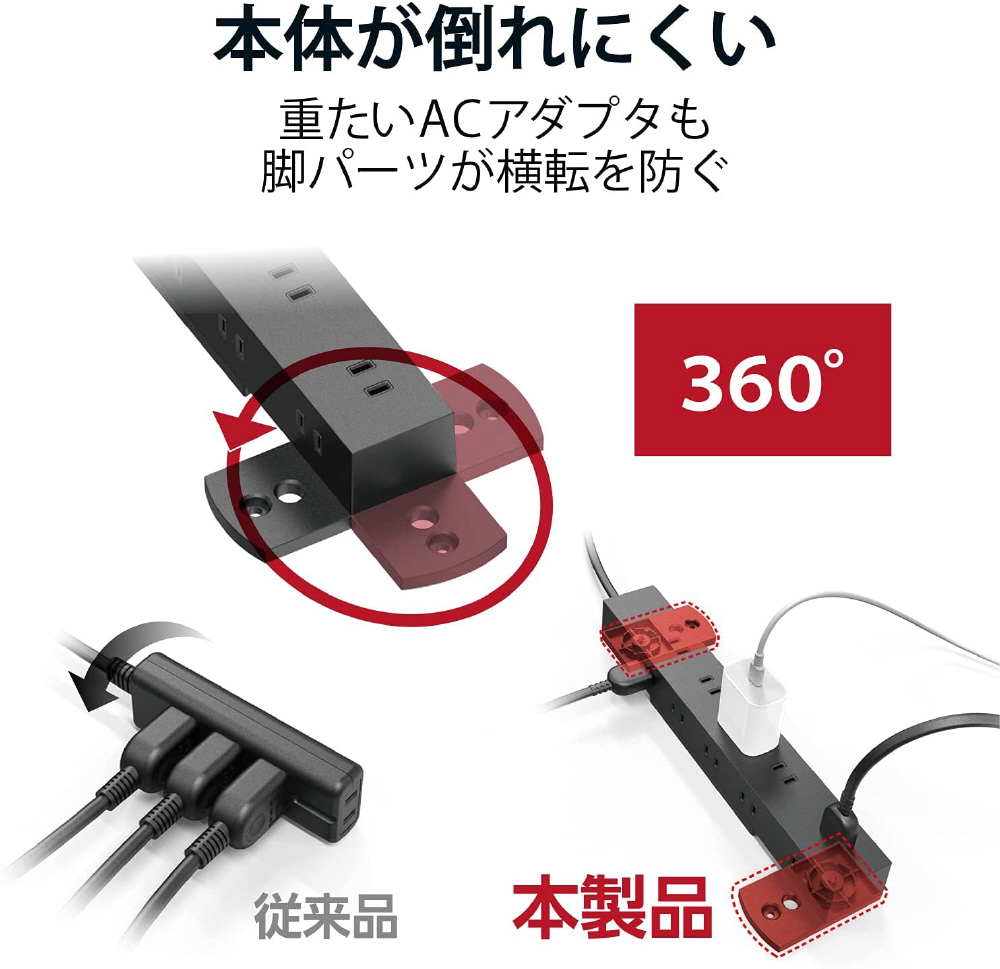 ■脚パーツを展開することで重いACアダプタなどを接続した際もタップが横転しにくくなります。
