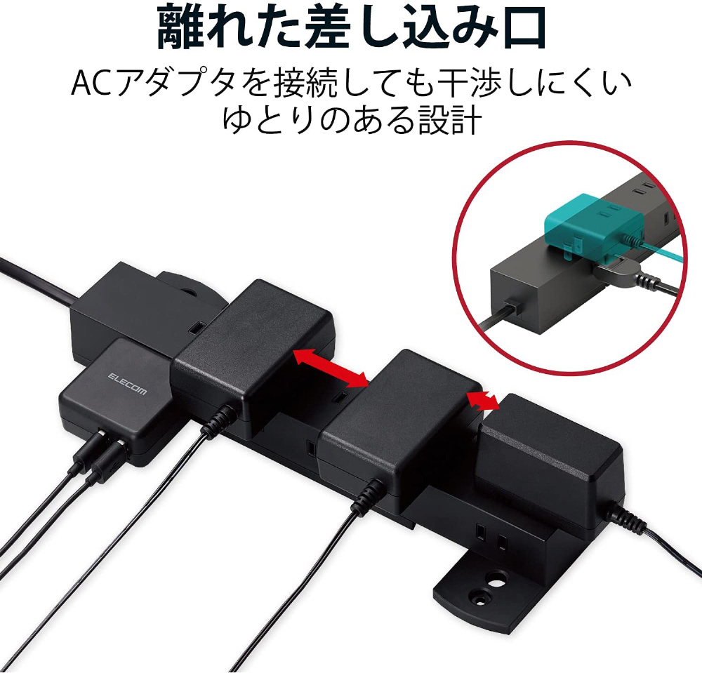 ■接続したプラグが隣の差込口に干渉しにくいよう、差込口の中心間が最短40mmと余裕のある設計となっています。また、それぞれの面の端1個口は57mmとさらに離した配置とし、大きなACアダプタなどでも利用しやすくしています。