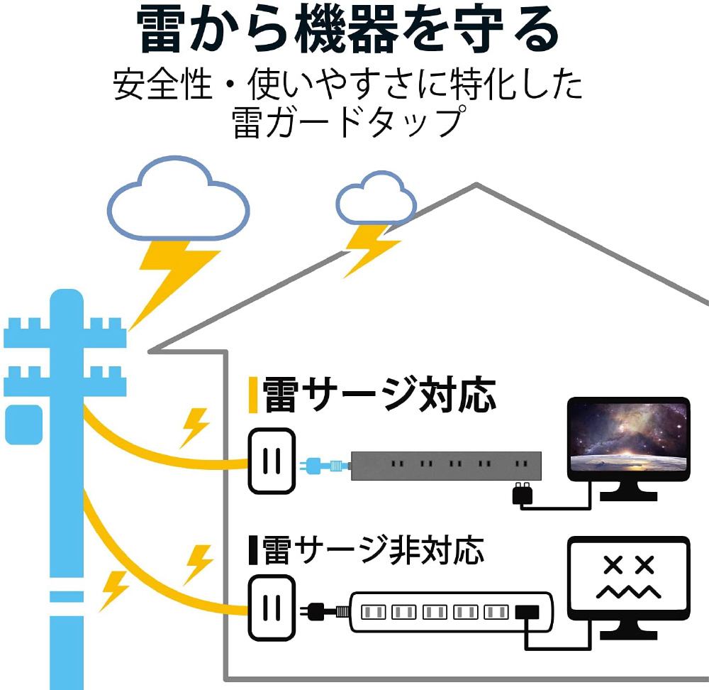 ■誘導雷による最大12500Vまでの雷サージを吸収する素子(バリスタ)を搭載し、接続機器を保護します。(※最大サージ電圧12500VはJEC210/212規格に基づく数値です。受けた電圧や回数により性能は劣化します。)