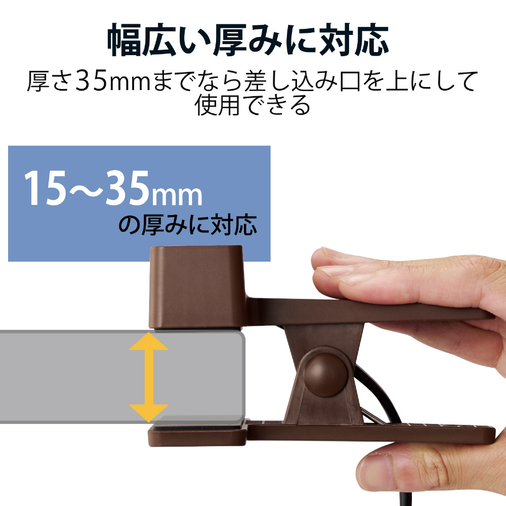 ■15mm〜35mmの厚さの板に設置が可能です。設置する際は差込口が上向きになるようにしてください。