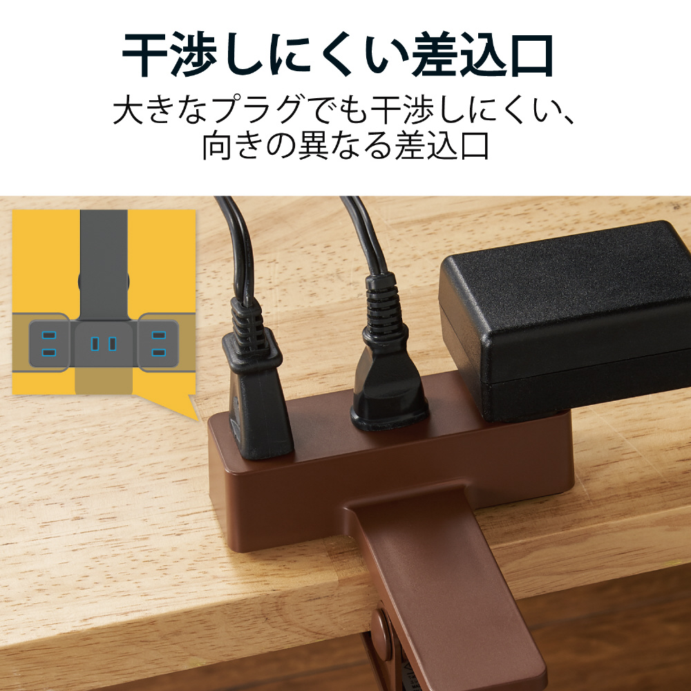 ■クリップ機構を搭載し、机などに挟んで利用することができる2ピン式の3個口タップです。