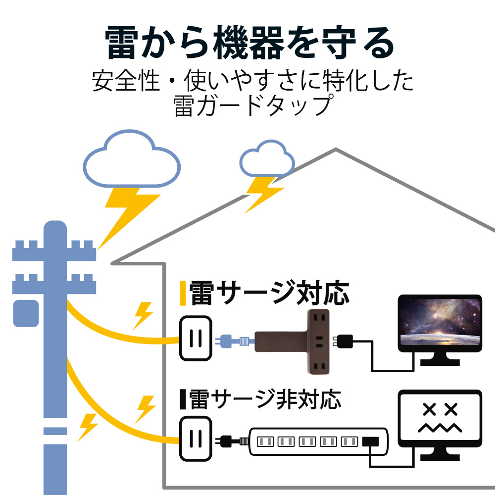 ■誘導雷による最大12500Vまでの雷サージを吸収する素子(バリスタ)を搭載し、接続機器を保護します。(※最大サージ電圧12500VはJEC210/212規格に基づく数値です。受けた電圧や回数により性能は劣化します。)